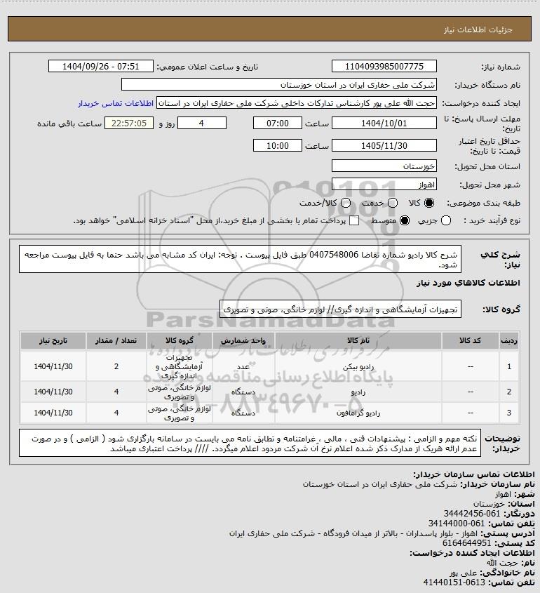 شرح کلی نیاز: شرح کالا رادیو شماره تقاضا 0407548006 طبق فایل پیوست . توجه: ایران کد مشابه می باشد حتما به فایل پیوست مراجعه شود.