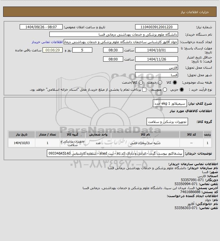 شرح کلی نیاز: سیمیلاتور ekg 1 عدد