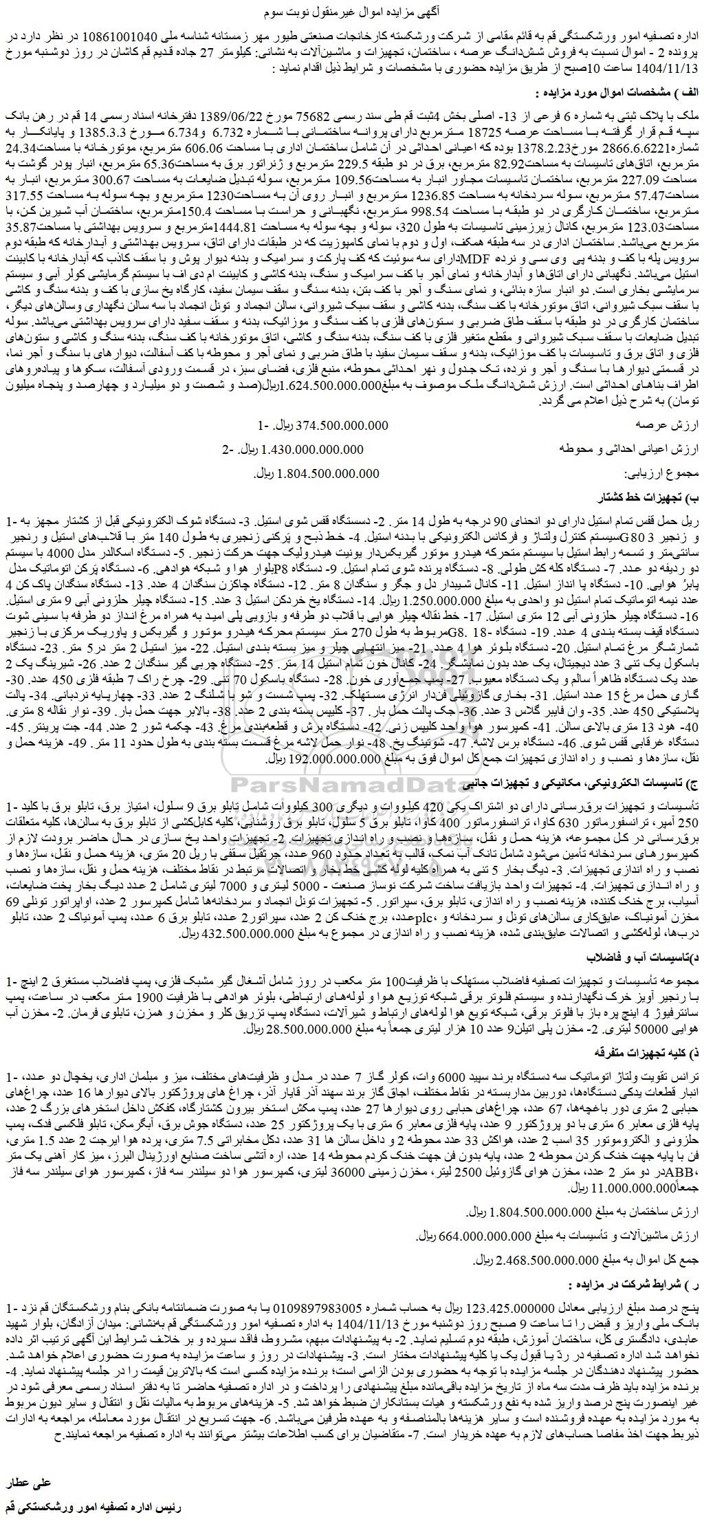 مزایده عمومی مزایده ملک با پلاک ثبتی به شماره 6 فرعی از 13- اصلی و برگزار میگردد. از کلیه افراد متخصص و شرکت‌های واجد شرایط دعوت به عمل می‌آید تا در این مزایده با کد خبرگزاری پارس نماد : 10010679 شرکت نمایند تاریخ شروع مزایده : 1404/09/25 مهلت شرکت در مزایده: تا پایان روز 1404/10/13 مکان برگزاری اموال واگذاری استان‌های مزایدات استان قم و دسته‌بندی‌های مربوط به این حراجی الکتروموتور و پمپ, ماشین آلات بسته بندی, برق, تجهیزات کارخانه ها و ماشین آلات صنعتی, ماشین آلات و تجهیزات کشاورزی و دام پروری, شیرآلات, لوله و اتصالات, ماشین اداری, آهن آلات, استیل و اهن نسوز, پلاستیک ، پلی اتیلن و مستر بچ, تاسیسات, کمپرسور هوا, قطعات فایبرگلاس, ماشین آلات انتقال مواد و نوار تسمه ای و زنجیره ای, املاک و زمین میباشد.