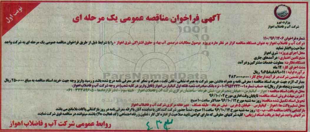 شرکت آب و فاضلاب اهواز بعنوان دستگاه مناقصه گزار در نظر دارد پروژه وصول مطالبات درصدی آب بهاء و حقوق اشتراکی شرق اهواز را با شرایط ذیل از طریق فراخوان مناقصه عمومی یک مرحله ای به شرکت واجد صلاحیت واگذار نماید
