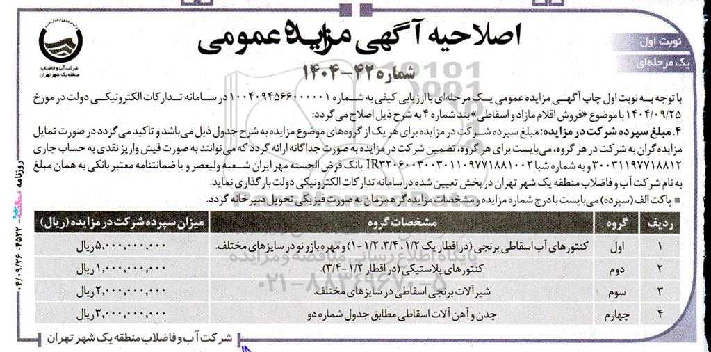 با توجه به نوبت اول چاپ آگهی مزایده عمومی یک مرحلهای با ارزیابی کیفی به شماره 1004094566000001 در سامانه تداركات الكترونیكی دولت در مورخ 1404.9.25 با موضوع «فروش اقلام مازاد و اسقاطی» بند شماره 4 به شرح ذیل اصلاح میگردد: