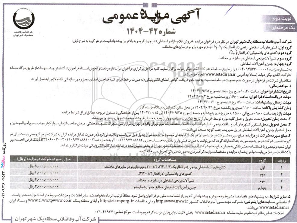 شرکت آب و فاضلاب منطقه یک شهر تهران در نظر دارد فراخوان مزایده فروش اقلام مازاد و اسقاطی»در چهار گروه و به بالاترین پیشنهاد قیمت در هر گروه به شرح ذیل: