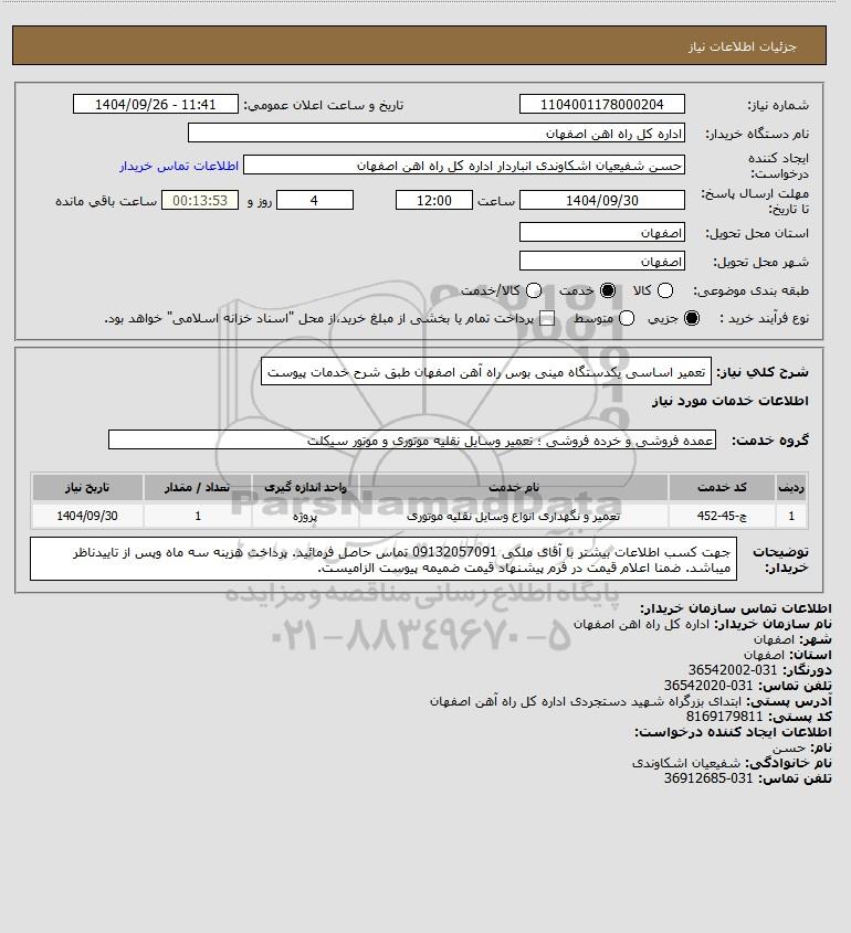 شرح کلی نیاز: تعمیر اساسی یکدستگاه مینی بوس راه آهن اصفهان طبق شرح خدمات پیوست
