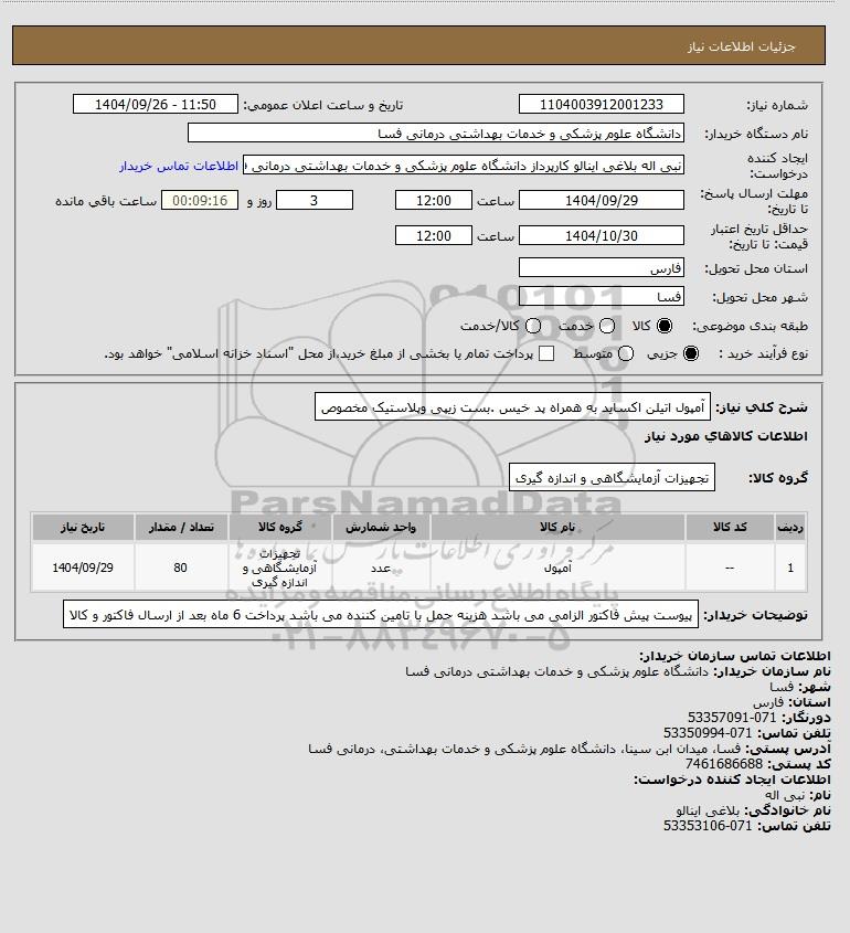 شرح کلی نیاز: آمپول اتیلن اکساید به همراه پد خیس .بست زیپی وپلاستیک مخصوص