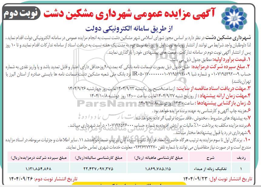 آگهی مزایده عمومی شهرداری مشکین دشت از طریق سامانه الکترونیکی دولت نوبت دوم ؟