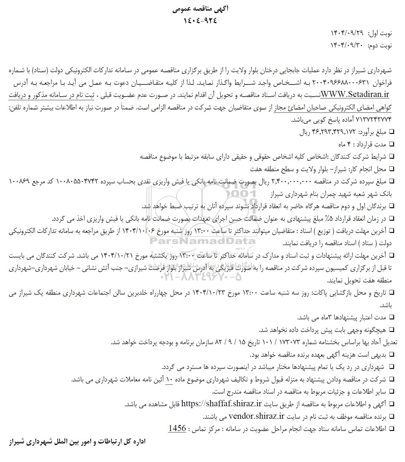 شهرداری شیراز در نظر دارد عملیات جابجایی درختان بلوار ولایت را از طریق برگزاری مناقصه عمومی در سامانه تدارکات الکترونیکی دولت (ستاد) با شماره فراخوان 2004096688000631 به اشخاص واجد شرایط واگذار نماید لذا از کلیه متقاضیان دعوت به عمل می آید با مراجعه به آدرس ستاد ایران نسبت به دریافت اسناد مناقصه و تحویل آن اقدام نمایند. در صورت عدم عضویت قبلی ، ثبت نام در سامانه مذکور و دریافت گواهی امضای الکترونیکی صاحبان امضای مجاز از سوی متقاضیان جهت شرکت در مناقصه الزامی است. ضمنا در صورت نیاز به اطلاعات بیشتر شماره تلفن: 7137242774 آماده پاسخ گویی میباشد.