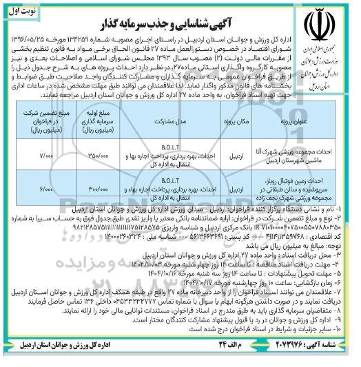 اداره کل ورزش و جوانان استان اردبیل در راستای اجرای مصوبه شماره 134259 مورخه 1396.05.25 شورای اقتصاد در خصوص دستور العمل ماده 27 قانون الحاق برخی مواد به قانون تنظیم بخشی از مقررات مالی دولت (2) مصوب سال 1393 مجلس شورای اسلامی و اصلاحات بعدی و نیز مصوبه کارگروه واگذاری استانی ماده 27 در نظر دارد احداث پروژه های به شرح جدول ذیل را از طریق فراخوان عمومی به سرمایه گذاران و مشارکت کنندگان واجد صلاحیت طبق ضوابط و بخشنامه های قانون مذکور واگذار نماید. لذا علاقمندان میتوانند طبق مهلت مشخص شده در ساعات اداری جهت تهیه اسناد فراخوان به واحد ماده 27 اداره کل ورزش و جوانان استان اردبیل مراجعه نمایند.