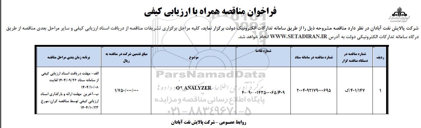 1 404/147/ک 2004092179000695 40-90-0143500065/P09 O2 ANALYZER  1.750.000.000 الف - مهلت دریافت اسناد ارزیابی کیفی از سامانه ستاد 1404.9.26 لغایت 1404.10.08
