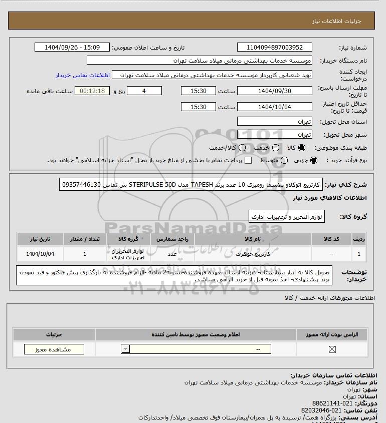 نام دستگاه خریدار:موسسه خدمات بهداشتی درمانی میلاد سلامت تهران