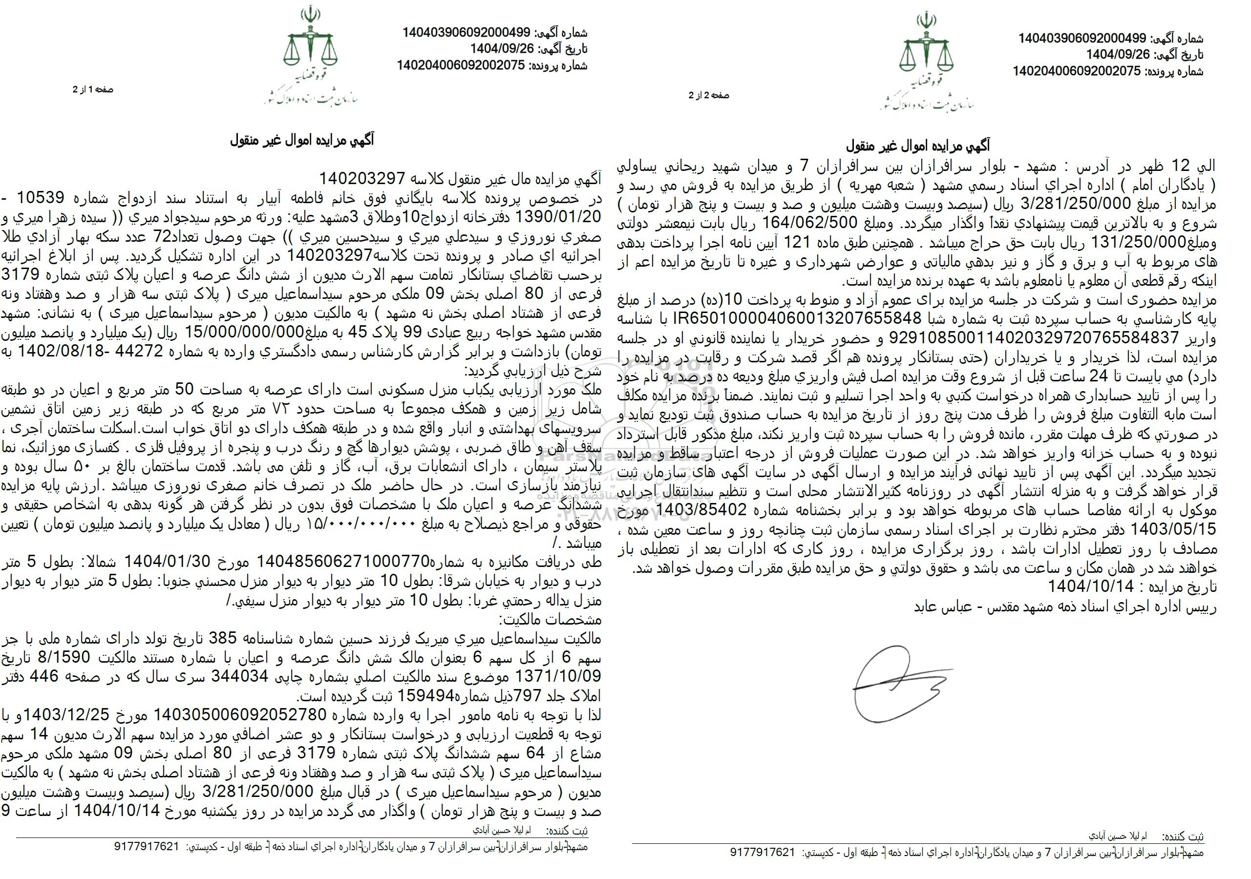 لذا با توجه به نامه مامور اجرا به وارده شماره 140305006092052780 مورخ 1403.12.25 و با توجه به قطعیت ارزیابی و درخواست بستانکار و دو عشر اضافی مورد مزایده سهم الارث مدیون 14 سهم مشاع از 64 سهم ششدانگ پلاک ثبتی شماره 3179 فرعی از 80 اصلی بخش 09 مشهد ملکی مرحوم سید اسماعیل میری ) پلاک تبنى سه هزار و صد و هفتاد و نه فرعی از هشتاد اصلی بخش به مشهد ) به مالکیت مدیون ( مرحوم سید اسماعیل میری ) در قبال مبلغ 3.281.250.000 ریال سیصد و بیست و هشت میلیون صد و بیست و پنج هزار تومان ) واگذار میگردد مزایده در روز یکشنبه مورخ 1404.10.14 از ساعت  9 الی 12 ظهر در آدرس : مشهد - بلوار سرافرازان بین سرافرازان 7 و میدان شهید ریحانی یساولی ) یادگاران امام ( اداره اجرای اسناد رسمی مشهد ( شعبه مهریه ( از طریق مزایده به فروش می رسد و مزایده از مبلغ 3.281.250.000 ریال سیصد و بیست و هشت میلیون و صد و بیست و پنج هزار تومان ) شروع و به بالاترین قیمت پیشنهادی نقداً واگذار میگردد و مبلغ 164.062.500 ریال بابت نیمعشر دولتی و مبلغ 131.250.000 ریال بابت حق حراج میباشد. همچنین طبق ماده 121 آیین نامه اجرا پرداخت بدهی های مربوط به آب و برق و گاز و نیز بدهی مالیاتی و عوارض شهرداری و غیره تا تاریخ مزایده اعم از اینکه رقم قطعی آن معلوم یا نامعلوم باشد به عهده برنده مزایده است.