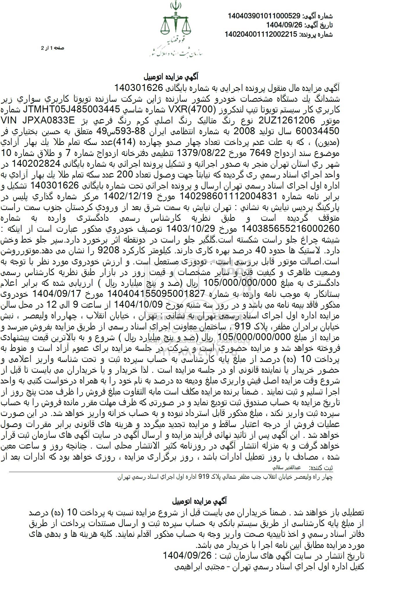 ششدانگ یک دستگاه مشخصات خودرو کشور سازنده ژاپن شرکت سازنده تویوتا کاربری سواری زیر کاربری کار سیستم تویوتا تیپ لندکروز (4700) VXR شماره شاسی JTMHT05J485003445 شماره موتور 221261206 نوع رنگ متالیک رنگ اصلی کرم رنگ فرعی بر VIN JPXA0833 60034450 سال تولید 2008 به شماره انتظامی ایران 8-593 س 49 متعلق به حسین بختیاری فر (مدیون)، که به علت عدم پرداخت تعداد چهار صدو چهارده (414) عدد سکه تمام طلا یک بهار آزادی موضوع سند ازدواج 7649 مورخ 1379.08.22 تنظیمی دفترخانه ازدواج شماره 7 و طلاق شماره 10 شهر ری استان تهران منجر به صدور اجرائیه و تشکیل پرونده اجرائی به شماره بایگانی 140202824 در واحد اجرای اسناد رسمی ری گردیده که نیابتا جهت وصول تعداد 200 عدد سکه تمام طلا یک بهار آزادی به اداره اول اجرای اسناد رسمی تهران ارسال و پرونده اجرائی تحت شماره بایگانی 140301626 تشکیل و برابر نامه شماره 140298601112004831 مورخ 1402.12.19 مرکز شماره گذاری پلیس در پارکینگ پردیس نیایش به نشانی : تهران نیایش به سمت شرق بعد از ورودی کردستان جنوب سمت راست متوقف گردیده است و طبق نظریه کارشناس رسمی دادگستری وارده به شماره 140385655216000260 مورخ 1403.10.29 توصیف خودروی مذکور عبارت است از اینکه : شیشه چراغ جلو راست شکسته است. گلگیر جلو راست در دو نقطه اثر برخورد دارد. سپر جلو خط وخش دارد. لاستیکها حدود 40 درصد بهره کاری دارند کیلومتر کارکرد 9208 را نشان می دهد. موتور روشن دو نقطه هر دو خورد دارد. است. اصالت موتور قابل بررسی است. تو دوری مستعمل است و ارزش خودروی مورد نظر با توجه به وضعیت ظاهری و کیفیت فنی و سایر مشخصات و قیمت روز در بازار طبق نظریه کارشناس رسمی دادگستری به مبلغ 105.000.000.000 ریال صد و پنج میلیارد ریال ( ارزیابی شده که برابر اعلام بستانکار به موجب نامه وارده به شماره 140404155095001827 مورخ 1404.09.17 خودروی مذکور فاقد بیمه نامه میباشد و در روز سه شنبه مورخ 1404.10.09 از ساعت 9 الی 12 در محل سالن مزایده اداره اول اجرای اسناد رسمی تهران به نشانی : تهران، خیابان انقلاب ، چهارراه ولیعصر ، نبش خیابان برادران مظفر پلاک 919 ، ساختمان معاونت اجرای اسناد رسمی از طریق مزایده بفروش میرسد و مزایده از مبلغ 105.000.000.000 ریال صد و پنج میلیارد ریال ( شروع و به بالاترین قیمت پیشنهادی فروخته خواهد شد و مزایده حضوری است و شرکت در جلسه مزایده برای عموم آزاد است و منوط به پرداخت 10 (ده) درصد از مبلغ پایه کارشناسی به حساب سپرده ثبت و تحت شناسه واریز اعلامی و حضور خریدار با نماینده قانونی او در جلسه مزایده است. لذا خریدار و یا خریداران می بایست تا قبل از شروع وقت مزایده اصل فیش واریزی مبلغ ودیعه ده درصد به نام خود را به همراه درخواست کتبی به واحد اجرا تسلیم و ثبت نمایند. ضمنا برنده مزایده مکلف است ما به التفاوت مبلغ فروش را ظرف مدت پنج روز از تاریخ مزایده به حساب صندوق ثبت تودیع نماید و در صورتی که ظرف مهلت مقرر مانده فروش را به حساب سپرده ثبت واریز نکند، مبلغ مذکور قابل استرداد نبوده و به حساب خزانه واریز خواهد شد. در این صورت عملیات فروش از درجه اعتبار ساقط و مزایده تجدید میگردد و هزینه های قانونی برابر مقررات وصول خواهد شد. این آگهی پس از تائید نهایی فرآیند مزایده و ارسال آگهی در سایت آگهی های سازمان ثبت قرار خواهد گرفت و به منزله انتشار آگهی در روزنامه کثیر الانتشار محلی است. چنانچه روز و ساعت معین شده ، مصادف با روز تعطیل ادارات باشد، روز برگزاری مزایده، روزی خواهد بود که ادارات بعد از تعطیلی باز خواهند شد. ضمناً خریداران می بایست قبل از شروع مزایده نسبت به پرداخت 10 (ده) درصد از مبلغ پایه کارشناسی از طریق سیستم بانکی به حساب سپرده ثبت و ارسال مستندات پرداخت از طریق دفاتر اسناد رسمی و اخذ تاییدیه صحت واریز وجه به حساب مذکور اقدام نمایند. کلیه هزینه ها و بدهی های مورد مزایده مطابق ایین نامه اجرا با خریدار می باشد.