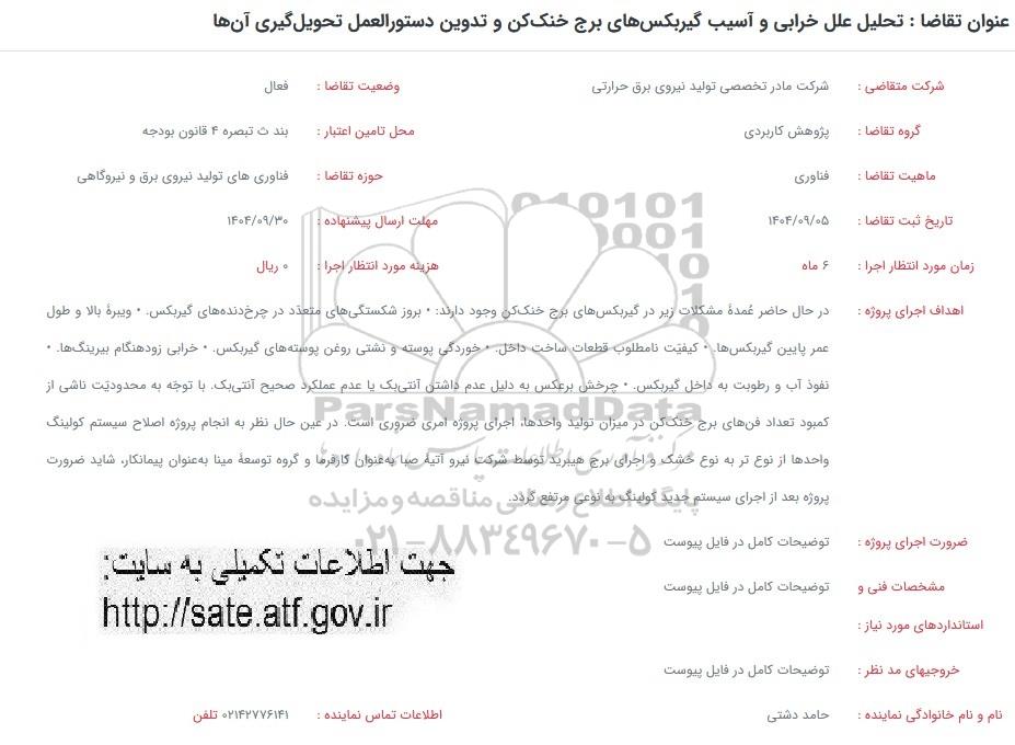 استعلام تحلیل علل خرابی و آسیب گیربکسهای برج خنک کن و تدوین دستورالعمل تحویل گیری آنها از کلیه افراد متخصص و شرکتها واجد شرایط دعوت به عمل میآید در مناقصه با کد خبرگزاری پارس نماد: 10014984 شرکت نمایند.
