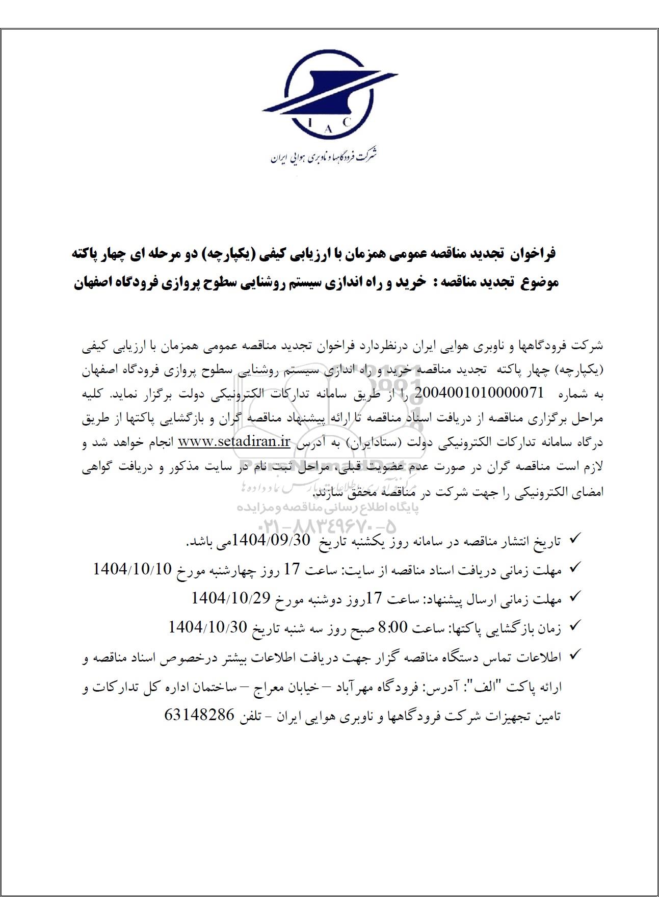 فراخوان تجدید  مناقصه عمومی همزمان با ارزیابی کیفی (فشرده) دو مرحله ای چهار پاکته موضوع مناقصه خرید و راه اندازی سیستم روشنایی سطوح پروازی فرودگاه اصفهان