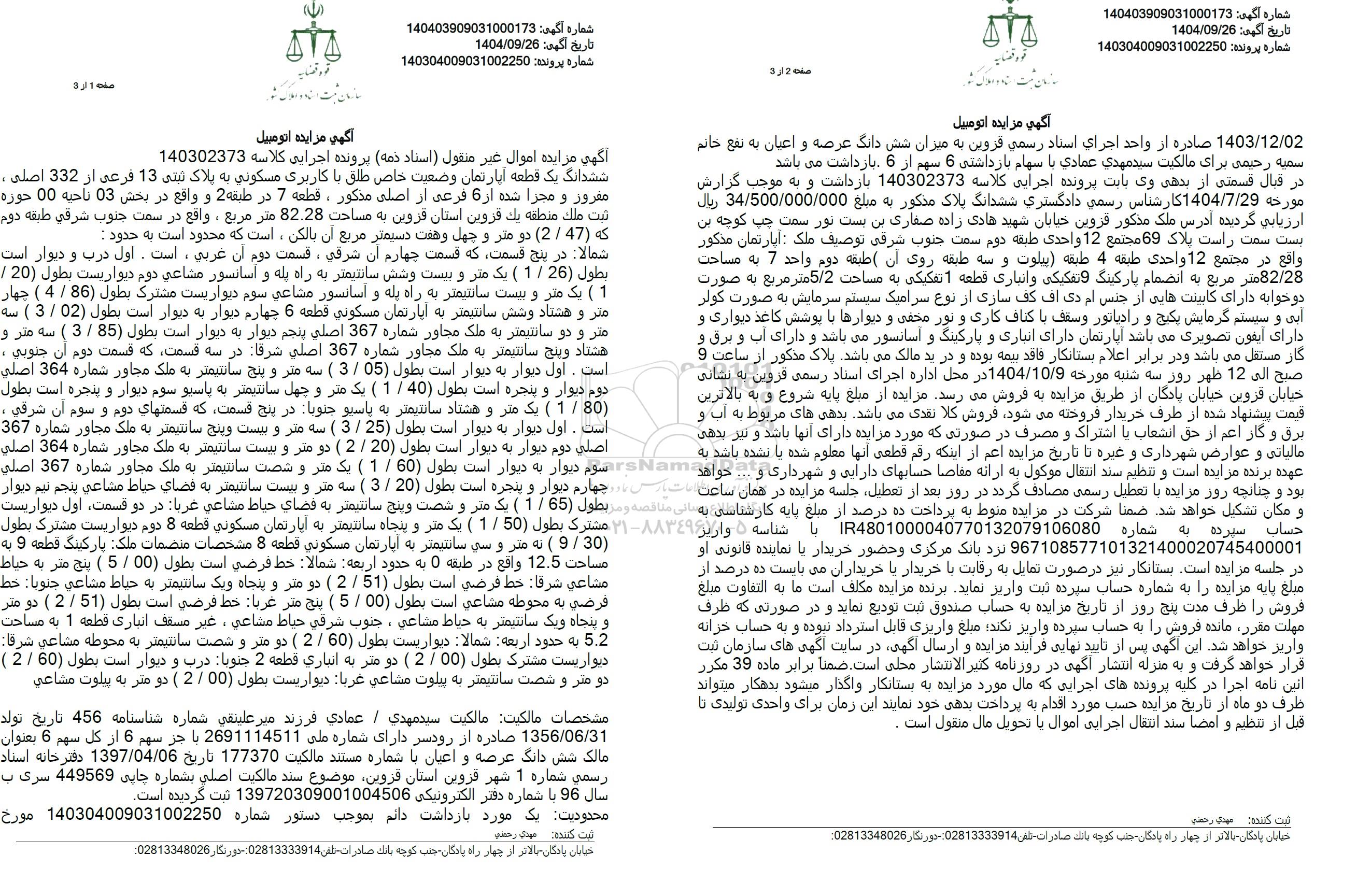 مشخصات مالکیت : مالکیت سید مهدی . عمادی فرزند میر علینقی شماره شناسنامه 456 تاریخ تولد 1356.06.31 صادره از رودسر دارای شماره ملی 2691114511 با جز سهم 6 از کل سهم 6 بعنوان مالک شش دانگ عرصه و اعیان با شماره مستند مالکیت 177370 تاریخ 1397.04.06 دفترخانه اسناد رسمی شماره 1 شهر قزوین استان قزوین موضوع سند مالکیت اصلی بشماره چاپی 449569 سری ب سال 96 با شماره دفتر الکترونیکی 139720309001004506 ثبت گردیده است. محدودیت یک مورد بازداشت دائم بموجب دستور شماره 140304009031002250 مورخ 1403.12.02 صادره از واحد اجرای اسناد رسمی قزوین به میزان شش دانگ عرصه و اعیان به نفع خانم سمیه رحیمی برای مالکیت سید مهدی عمادی با سهام بازداشتی 6 سهم از 6 بازداشت می باشد در قبال قسمتی از بدهی وی بابت پرونده اجرایی کلاسه 140302373 بازداشت و به موجب گزارش مورخه 1404.7.29 کارشناس رسمی دادگستری ششدانگ پلاک مذکور به مبلغ 34.500.000.000 ریال 3 ارزیابی گردیده آدرس ملک مذکور قزوین خیابان شهید هادی زاده صفاری بن بست نور سمت چپ کوچه بن بست سمت راست پلاک 69 مجتمع 12 واحدى طبقه دوم سمت جنوب شرقی توصیف ملک آپارتمان مذکور واقع در مجتمع 12 واحدی طبقه 4 طبقه ببلوت) و سه طبقه روی آن طبقه دوم واحد 7 به مساحت 82.28 متر مربع به انضمام پارکینگ و تفکیکی و انباری قطعه 1 تفکیکی به مساحت 5.2 متر مربع به صورت دوخوابه دارای کابینت هایی از جنس ام دی اف کف سازی از نوع سرامیک سیستم سرمایش به صورت کولر ابی و سیستم گرمایش پکیج و رادیاتور وسقف با کناف کاری و نور مخفی و دیوارها با پوشش کاغذ دیواری و دارای ایفون تصویری میباشد آپارتمان دارای انباری و پارکینگ و آسانسور میباشد و دارای آب و برق و گار مستقل می باشد و در برابر اعلام بستانکار فاقد بیمه بوده و در ید مالک می باشد. پلاک مذکور از ساعت 9 صبح الی 12 ظهر روز سه شنبه مورخه 1404.10.9 در محل اداره اجرای اسناد رسمی قزوین به نشانی خیابان قزوین خیابان پادگان از طریق مزایده به فروش میرسد. مزایده از مبلغ پایه شروع و به بالاترین ( قیمت پیشنهاد شده از طرف خریدار فروخته میشود فروش کلا نقدی میباشد بدهی های مربوط به آب و برق و گاز اعم از حق انشعاب با اشتراک و مصرف در صورتی که مورد مزایده دارای آنها باشد و نیز بدهی مالیاتی و عوارض شهرداری و غیره تا تاریخ مزایده اعم از اینکه رقم قطعی آنها معلوم شده یا نشده باشد به عهده برنده مزایده است و تنظیم سند انتقال موکول به ارائه مقاضا حسابهای دارایی و شهرداری و .... خواهد بود و چنانچه روز مزایده با تعطیل رسمی مصادف گردد در روز بعد از تعطیل جلسه مزایده در همان ساعت و مکان تشکیل خواهد شد. ضمنا شرکت در مزایده منوط به پرداخت ده درصد از مبلغ پایه کارشناسی به حساب سپرده به شماره R4801000040770132079106080 با شناسه واریز ( 967108577101321400020745400001 نزد بانک مرکزی و حضور خریدار با نماینده قانونی او در جلسه مزایده است. بستانکار نیز در صورت تمایل به رقابت با خریدار یا خریداران می بایست ده درصد از مبلغ پایه مزایده را به شماره حساب سپرده ثبت واریز نماید. برنده مزایده مکلف است ما به التفاوت مبلغ فروش را ظرف مدت پنج روز از تاریخ مزایده به حساب صندوق ثبت تودیع نماید و در صورتی که ظرف و مهلت مقرر مانده فروش را به حساب سپرده واریز نکند مبلغ واریزی قابل استرداد نبوده و به حساب خرانه واریز خواهد شد. این آگهی پس از تایید نهایی فرآیند مزایده و ارسال آگهی در سایت آگهی های سازمان ثبت قرار خواهد گرفت و به منزله انتشار آگهی در روزنامه کثیر الانتشار محلی است. ضمنا برابر ماده 39 مکرر ائین نامه اجرا در کلیه پرونده های اجرایی که مال مورد مزایده به بستانکار واگذار میشود بدهکار میتواند. طرف دو ماه از تاریخ مزایده حسب مورد اقدام به پرداخت بدهی خود نمایند این زمان برای واحدی تولیدی تا قبل از تنظیم و امضا سند انتقال اجرایی اموال یا تحویل مال منقول است .