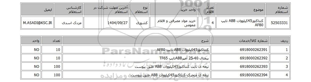 | 52503331 | کنتاکتور45کیلووات ABB تایپ AF80 | 4 | خرید مواد مصرفی و اقلام عمومی | کشوری | 1404/09/27 | مزدک اسدی | M.ASADI@KSC.IR |