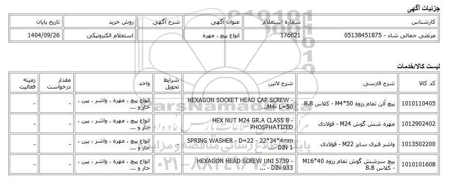 | مرتضی جمالی شاد - 05138451875 | 176621 | انواع پیچ ، مهره | استعلام الکترونیکی | 1404/09/26 |