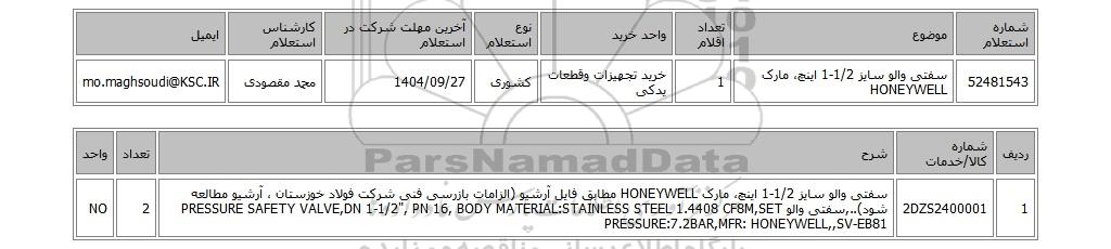 | 52481543 | سفتی والو سایز 1/2-1 اینچ، مارک HONEYWELL | 1 | خرید تجهیزات وقطعات یدکی | کشوری | 1404/09/27 | محمد مقصودی | mo.maghsoudi@KSC.IR |