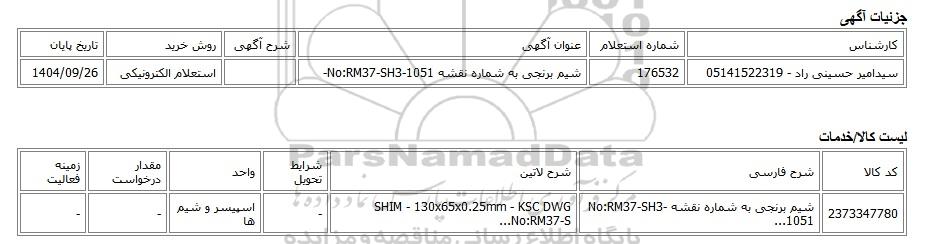 | سیدامیر حسینی راد - 05141522319 | 176532 | شیم برنجی به شماره نقشه No:RM37-SH3-1051- | استعلام الکترونیکی | 1404/09/26 |