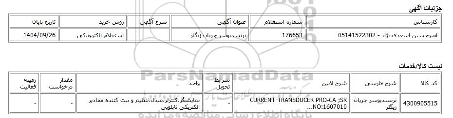 | امیرحسین اسعدی نژاد - 05141522302 | 176653 | ترنسدیوسر جریان زیگلر | استعلام الکترونیکی | 1404/09/26 |