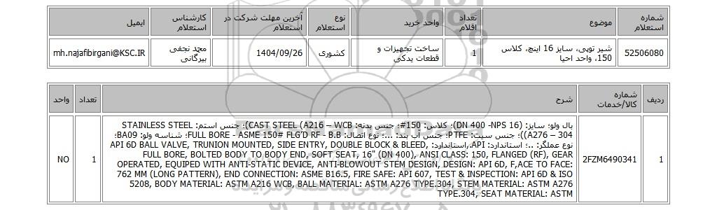 | 52506080 | شیر توپی، سایز 16 اینچ، کلاس 150، واحد احیا | 1 | ساخت تجهیزات و قطعات یدکی | کشوری | 1404/09/26 | محمد نجفی بیرگانی | mh.najafibirgani@KSC.IR |