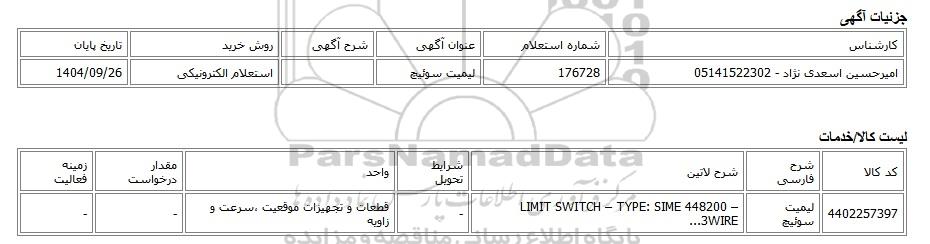 | امیرحسین اسعدی نژاد - 05141522302 | 176728 | لیمیت سوئیچ | استعلام الکترونیکی | 1404/09/26 |