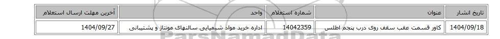 1404/09/18کاور قسمت عقب سقف روی درب پنجم اطلس14042359اداره خرید مواد شیمیایی سالنهای مونتاژ و پشتیبانی1404/09/27