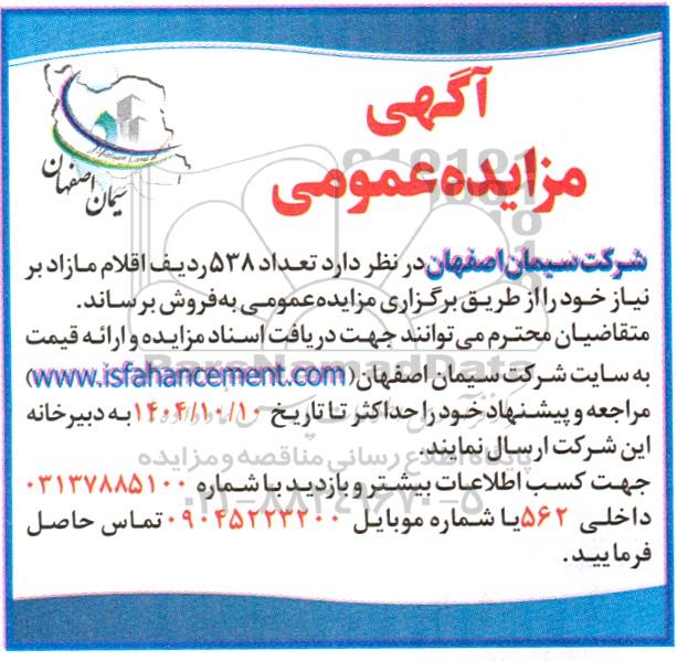 شرکت سیمان اصفهان در نظر دارد تعداد 538 ردیف اقلام مازاد بر نیاز خود را از طریق برگزاری مزایده عمومی به فروش برساند.