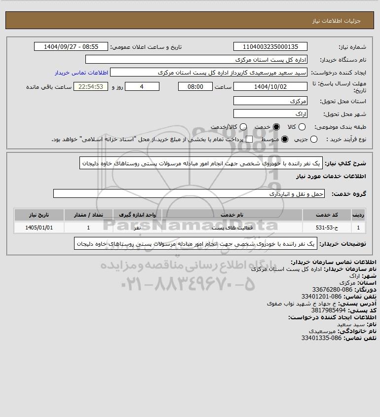 شرح کلی نیاز: یک نفر راننده با خودروی شخصی جهت انجام امور مبادله مرسولات پستی روستاهای خاوه دلیجان