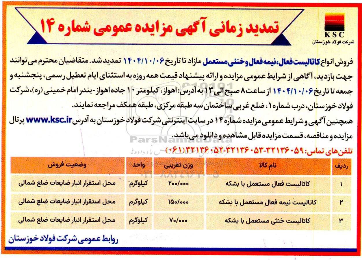 فروش انواع کاتالیست فعال ، نیمه فعال و خنثی مستعمل مازاد تا تاریخ 1404.10.6 تمدید شد. متقاضیان محترم میتوانند جهت بازدید آگاهی از شرایط عمومی مزایده و ارائه پیشنهاد قیمت همه روزه به استثنای ایام تعطیل رسمی پنجشنبه و جمعه تا تاریخ 1404.10.6 از ساعت 8 صبح الی 13 به آدرس اهواز، کیلومتر 10 جاده اهواز - بندر امام خمینی (ره) شرکت فولاد خوزستان درب شماره 1 ، ضلع غربی ساختمان سه طبقه ،مرکزی طبقه همکف مراجعه نمایند.