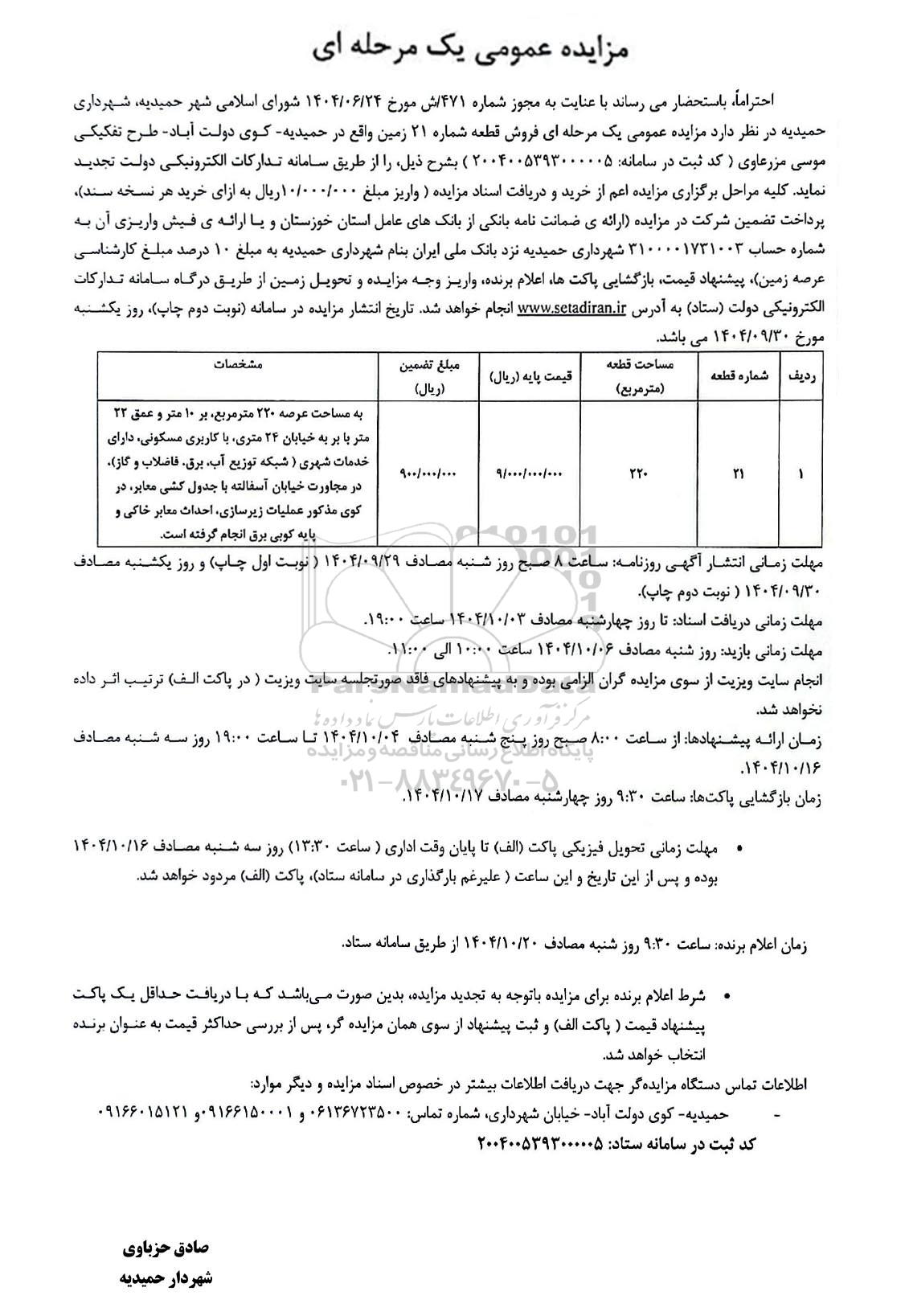 احتراماً، باستحضار میرساند با عنایت به مجوز شماره 471ش مورخ 1404.06.24 شورای اسلامی شهر حمیدیه شهرداری حمیدیه در نظر دارد مزایده عمومی یک مرحله ای فروش قطعه شماره 21 زمین واقع در حمیدیه کوی دولت آباد - طرح تفکیکی موسی مزرعاوی (کد ثبت در سامانه 2004005393000005) بشرح ذیل را از طریق سامانه تدارکات الکترونیکی دولت اجرا نماید. کلیه مراحل برگزاری مزایده اعم از خرید و دریافت اسناد مزایده (واریز مبلغ 10.000.000 ریال به ازای خرید هر نسخه سند) پرداخت تضمین شرکت در مزایده ارائه ی ضمانت نامه بانکی از بانکهای عامل استان خوزستان و یا ارائه ی فیش واریزی آن به شماره حساب 3100001731003 شهرداری حمیدیه نزد بانک ملی ایران بنام شهرداری حمیدیه به مبلغ 10 درصد مبلغ کارشناسی عرصه زمین، پیشنهاد قیمت بازگشایی پاکتها اعلام برنده واریز وجه مزایده و تحویل زمین از طریق درگاه سامانه تدارکات الکترونیکی دولت (ستاد) به آدرس سایت ستاد ایران انجام خواهد شد. تاریخ انتشار مزایده در سامانه نوبت دوم چاپ روز یکشنبه مورخ 1404.9.30 می باشد.