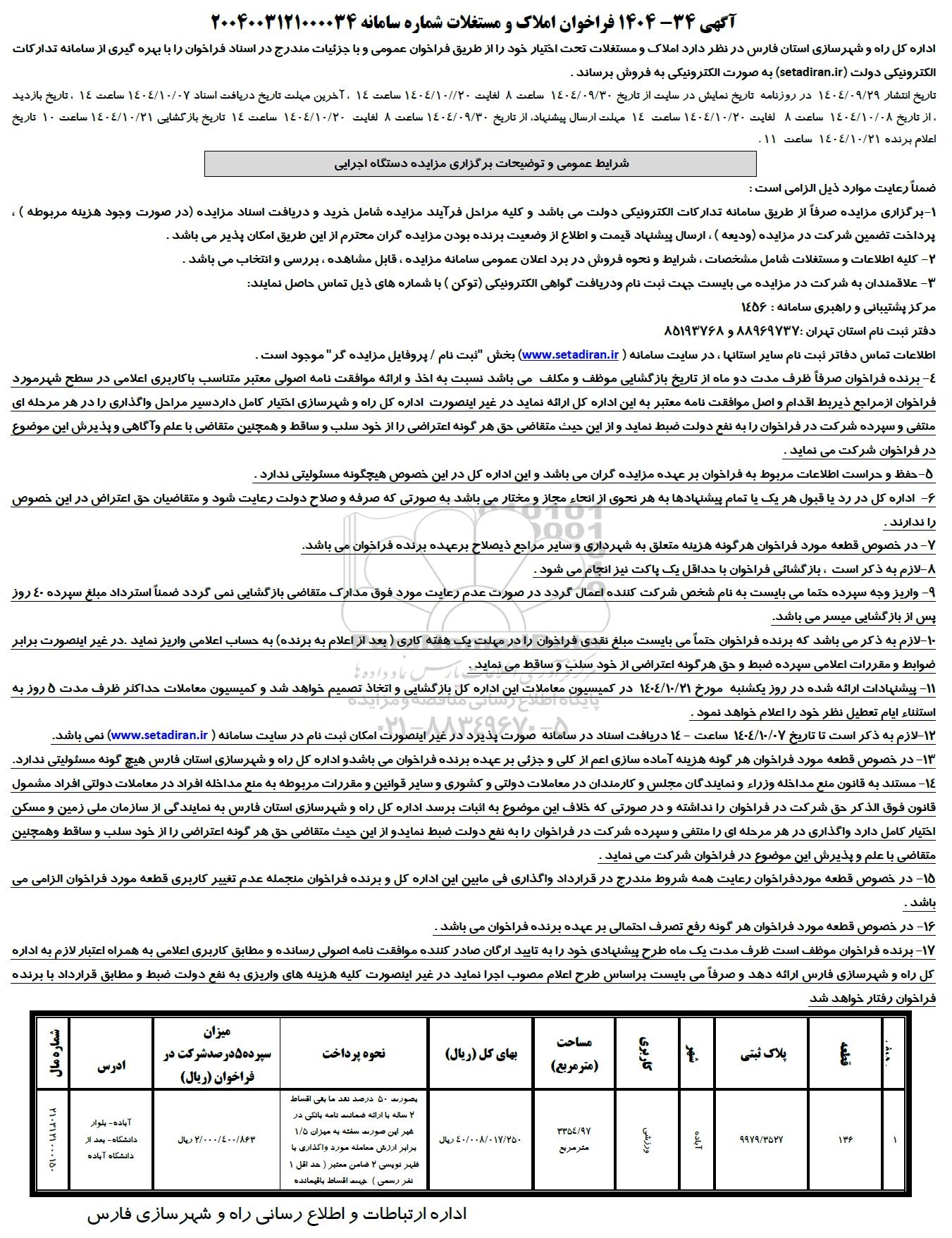 اداره کل راه و شهرسازی استان فارس در نظر دارد زمین تحت اختیار خود را از طریق مزایده عمومی و با جزئیات مندرج در اسناد مزایده را با بهره گیری از سامانه تدارکات الکترونیکی دولت سایت ستاد ایران به صورت الکترونیکی به فروش برساند.
