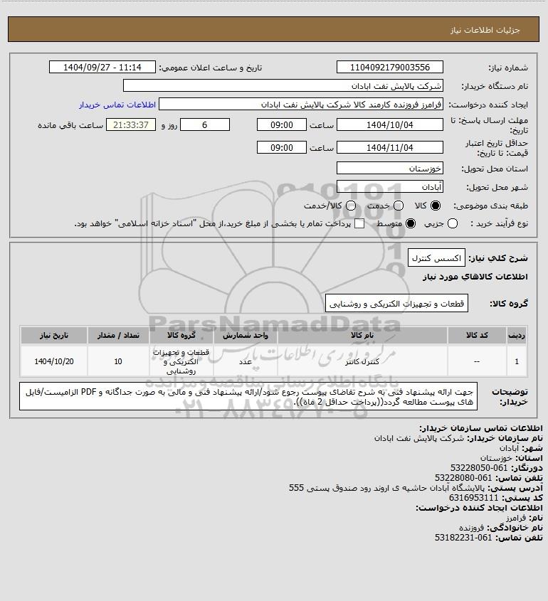 | 1 | -- | کنترل کانتر | عدد | قطعات و تجهیزات الکتریکی و روشنایی | 10 | 1404/10/20 |