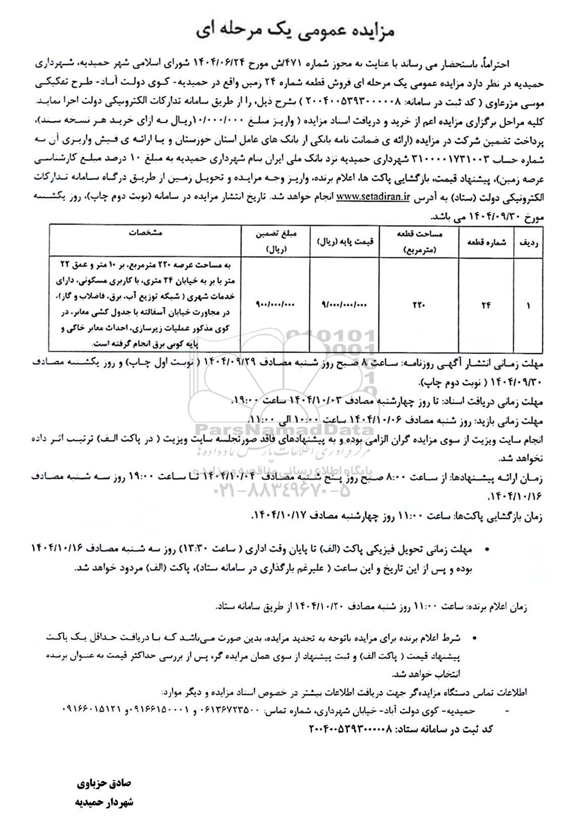احتراماً، باستحضار میرساند با عنایت به مجوز شماره 471/ ش مورخ 1404.06.24 شورای اسلامی شهر حمیدیه، شهرداری حمیدیه در نظر دارد مزایده عمومی یک مرحله ای فروش قطعه شماره 24 زمین واقع در حمیدیه - کوی دولت آباد - طرح تفکیکی موسی مزرعاوی (کد ثبت در سامانه 2004005393000008) بشرح ذیل را از طریق سامانه تدارکات الکترونیکی دولت اجرا نماید. کلیه مراحل برگزاری مزایده اعم از خرید و دریافت اسناد مزایده (واریز مبلغ 10.000.000 ریال به ازای خرید هر نسخه سند) پرداخت تضمین شرکت در مزایده (ارائه ی ضمانت نامه بانکی از بانکهای عامل استان خوزستان و یا ارائه ی فیش واریزی آن به شماره حساب 3100001731003 شهرداری حمیدیه نزد بانک ملی ایران بنام شهرداری حمیدیه به مبلغ 10 درصد مبلغ کارشناسی عرصه زمین) پیشنهاد قیمت، بازگشایی پاکت ها، اعلام برنده، واریز وجه مزایده و تحویل زمین از طریق درگاه سامانه تدارکات الکترونیکی دولت (ستاد) نجام خواهد شد. تاریخ انتشار مزایده در سامانه (نوبت دوم چاپ)، روز یکشنبه مورخ 1404.09.30 می باشد.