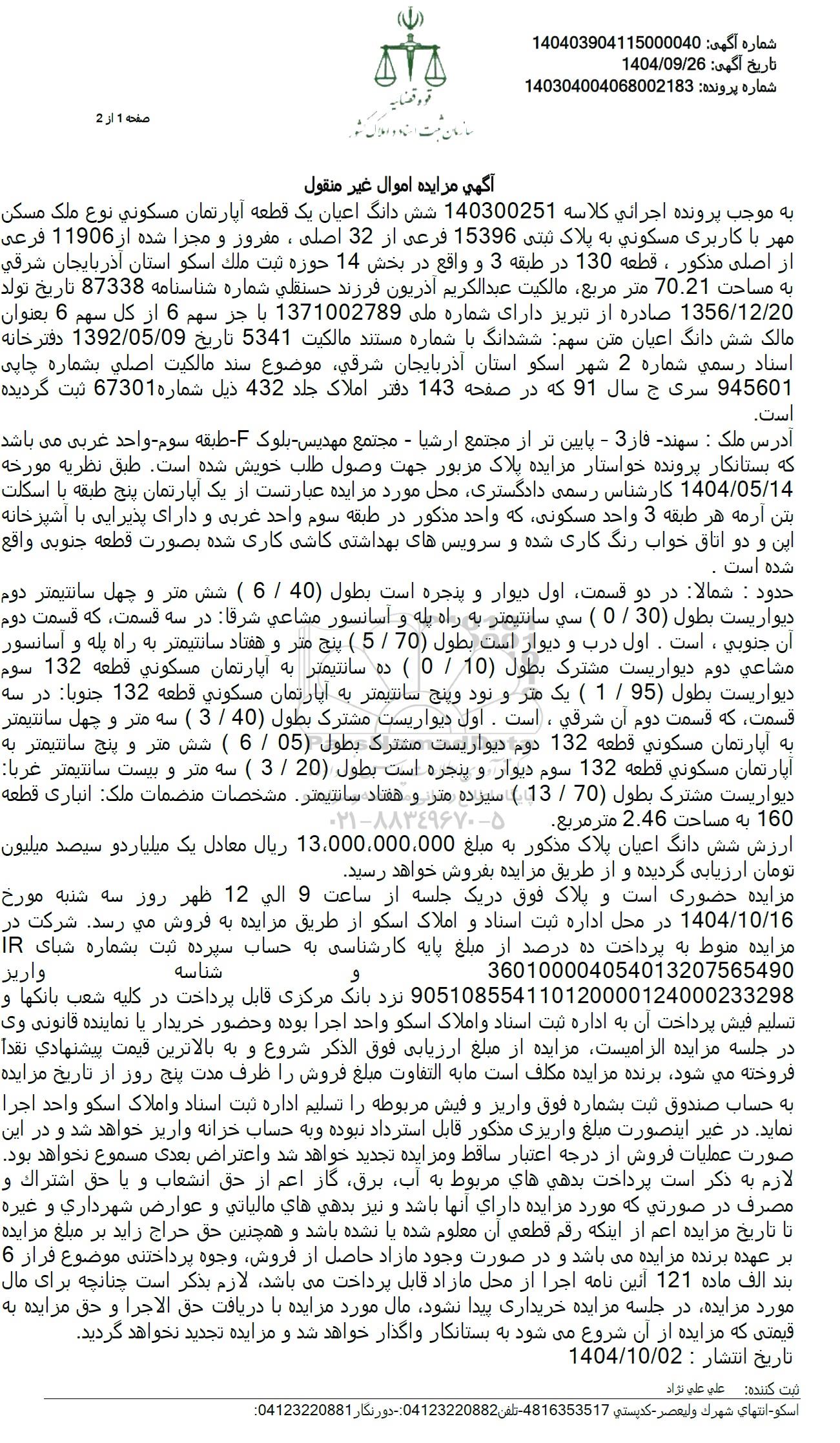 به موجب پرونده اجرایی كلاسه 140300251 شش دانگ اعیان یک قطعه آپارتمان مسکونی نوع ملک مسکن مهر با کاربری مسکونی به پلاک ثبتی 15396 فرعی از 32 اصلی، مفروز و مجزا شده از 11906 فرعی از اصلی مذکور ، قطعه 130 در طبقه 3 و واقع در بخش 14 حوزه ثبت ملك اسكو استان آذربایجان شرقی به مساحت 70.21 متر مربع مالكيت عبد الکریم آذریون فرزند حسنقلی شماره شناسنامه 87338 تاریخ تولد 1356.12.20 صادره از تبریز دارای شماره ملی 1371002789 با جز سهم 6 از کل سهم 6 بعنوان مالک شش دانگ اعیان متن سهم ششدانگ با شماره مستند مالکیت 5341 تاریخ 1392.05.09 دفترخانه اسناد رسمی شماره 2 شهر اسکو استان آذربایجان شرقی موضوع سند مالکیت اصلی بشماره چاپی 945601 سری ج سال 91 که در صفحه 143 دفتر املاک جلد 432 ذیل شماره 67301 ثبت گردیده است.