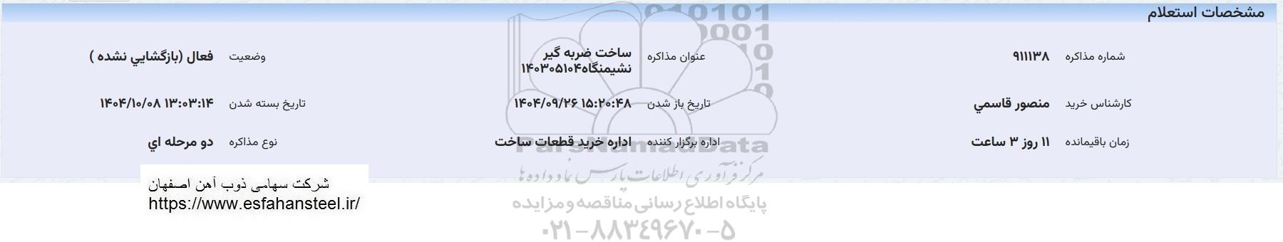 استعلام بها و موضوع استعلام استعلام ساخت ضربه گیر نشیمنگاه به اطلاع کلیه شرکتها و افراد متخصص واجد شرایط میرساند، آگهی گذار در نظر دارد از طریق استعلام بها، نسبت به انتخاب و دریافت پیشنهادات اقدام نماید. این استعلام با کد آگهی ثبت شده در سامانه خبرگزاری پارس نماد : 10017471 منتشر شده است. مشخصات استعلام : تاریخ شروع استعلام: 1404/09/27 آخرین مهلت ارسال پیشنهاد قیمت : 1404/10/08 و محل اجرای پروژه : استان مناقصات استان سایر میباشد. استعلام قیمت مورد درخواست : استعلام ساخت ضربه گیر نشیمنگاه با دستهبندیهای تخصصی و گروه های مرتبط : ساخت،نصب و تعمیرات صنایع فولاد, قطعات لاستیکی, تجهیزات و ماشین آلات صنعتی, استعلام اطلاع رسانی میگردد.
