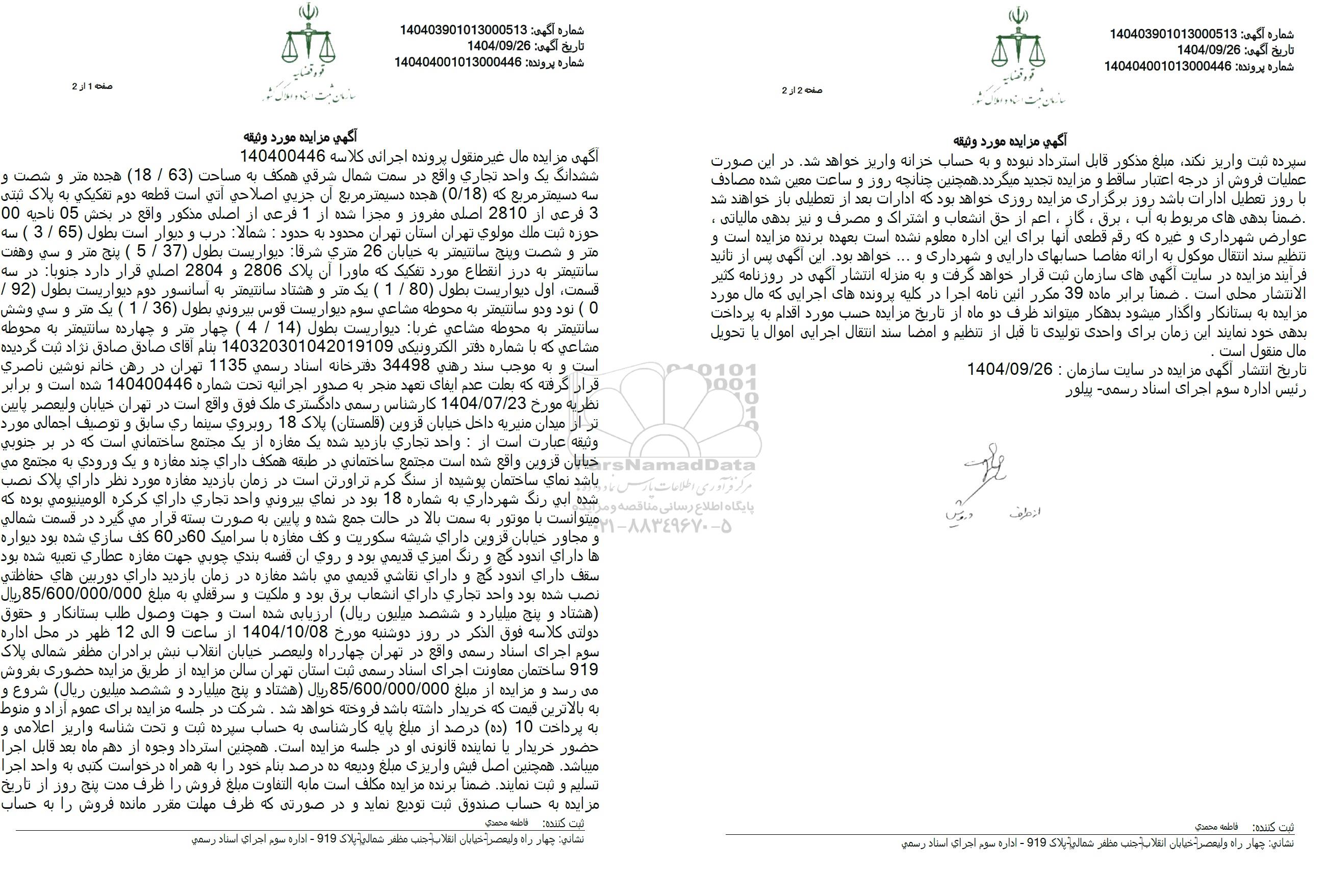آگهی مزایده مال غیر منقول پرونده اجرائی کلاسه 140400446 ششدانگ یک واحد تجاری واقع در سمت شمال شرقی همکف به مساحت (63) . (18) هجده متر و شصت و سه دسیمتر مربع که (0.18) هجده دسیمتر مربع آن جزیی اصلاحی آتی است قطعه دوم تفکیکی به پلاک ثبتی 3 فرعی از 2810 اصلی مفرور و مجزا شده از 1 فرعی از اصلی مذکور واقع در بخش 05 ناحیه 00 حوزه ثبت ملک مولوی تهران استان تهران محدود به حدود : شمالا درب و دیوار است بطول (65 . 3 ) سه متر و شصت وپنج سانتیمتر به خیابان 26 متری شرقا دیوار یست بطول (37) . 5 ) پنج متر و سی و هفت سانتیمتر به درز انقطاع مورد تفکیک که ماورا آن پلاک 2806 و 2804 اصلی قرار دارد جنوبا در سه قسمت اول دیواریست بطول 80 . 1 ) یک متر و هشتاد سانتیمتر به آسانسور دوم دیواریست بطول (92) .0) نود و دو سانتیمتر به محوطه مشاعی سوم دیواریست قوس بیرونی بطول (36 . 1 ) یک متر و سی وشش سانتیمتر به محوطه مشاعی غربا دیواریست بطول 14 . 4 ) چهار متر و چهارده سانتیمتر به محوطه مشاعی که با شماره دفتر الکترونیکی 140320301042019109 بنام آقای صادق صادق نژاد ثبت گردیده است و به موجب سند رهنی 34498 دفترخانه اسناد رسمی 1135 تهران در رهن خانم نوشین ناصری قرار گرفته که بعلت عدم ایفای تعهد منجر به صدور اجرائیه تحت شماره 140400446 شده است و برابر نظریه مورخ 1404.07.23 کارشناس رسمی دادگستری ملک فوق واقع است در تهران خیابان ولیعصر پایین تر از میدان منیریه داخل خیابان قزوین (قلمستان) پلاک 18 روبروی سینما ری سابق و توصیف اجمالی مورد وثیقه عبارت است از: واحد تجاری بازدید شده یک مغازه از یک مجتمع ساختمانی است که در بر جنوبی خیابان قزوین واقع شده است مجتمع ساختمانی در طبقه همکف دارای چند مغاره و یک ورودی به مجتمع می باشد نمای ساختمان پوشیده از سنگ کرم تراورتن است در زمان بازدید مغازه مورد نظر دارای پلاک نصب شده آبی رنگ شهرداری به شماره 18 بود در نمای بیرونی واحد تجاری دارای کرکره الومینیومی بوده که میتوانست با موتور به سمت بالا در حالت جمع شده و پایین به صورت بسته قرار میگیرد در قسمت شمالی و مجاور خیابان قزوین دارای شیشه سکوریت و کف مغازه با سرامیک 60 در 60 کف سازی شده بود دیواره ها دارای اندود گچ و رنگ امیزی قدیمی بود و روی آن قفسه بندی چوبی جهت مغازه عطاری تعبیه شده بود. سقف دارای اندود گچ و دارای نقاشی قدیمی می باشد مغازه در زمان باردید دارای دوربین های حفاظتی نصب شده بود واحد تجاری دارای انشعاب برق بود و ملکیت و سرقفلی به مبلغ 85.600.000.000 ریال هشتاد و پنج میلیارد و ششصد میلیون ریال ارزیابی شده است و جهت وصول طلب بستانکار و حقوق دولتی کلاسه فوق الذکر در روز دوشنبه مورخ 1404.10.08 از ساعت 9 الى 12 ظهر در محل اداره سوم اجرای اسناد رسمی واقع در تهران چهارراه ولیعصر خیابان انقلاب نبش برادران مظفر شمالی پلاک 919 ساختمان معاونت اجرای اسناد رسمی ثبت استان تهران سالن مزایده از طریق مزایده حضوری بفروش می رسد و مزایده از مبلغ 85.600.000.000 ریال هشتاد و پنج میلیارد و ششصد میلیون ریال) شروع و به بالاترین قیمت که خریدار داشته باشد فروخته خواهد شد. شرکت در جلسه مزایده برای عموم آزاد و منوط به پرداخت 10 (ده) درصد از مبلغ پایه کارشناسی به حساب سپرده ثبت و تحت شناسه واریز اعلامی و حضور خریدار با نماینده قانونی او در جلسه مزایده است. همچنین استرداد وجوه از دهم ماه بعد قابل اجرا میباشد. همچنین اصل فیش واریزی مبلغ ودیعه ده درصد بنام خود را به همراه درخواست کتبی به واحد اجرا تسلیم و ثبت نمایند. ضمناً برنده مزایده مکلف است مابه التفاوت مبلغ فروش را ظرف مدت پنج روز از تاریخ مزایده به حساب صندوق ثبت تودیع نماید و در صورتی که ظرف مهلت مقرر مانده فروش را به حساب سپرده ثبت واریز نکند مبلغ مذکور قابل استرداد نبوده و به حساب خزانه واریز خواهد شد. در این صورت عملیات فروش از درجه اعتبار ساقط و مزایده تجدید میگردد. همچنین چنانچه روز و ساعت معین شده مصادف با روز تعطیل ادارات باشد روز برگزاری مزایده روزی خواهد بود که ادارات بعد از تعطیلی باز خواهند شد. 
