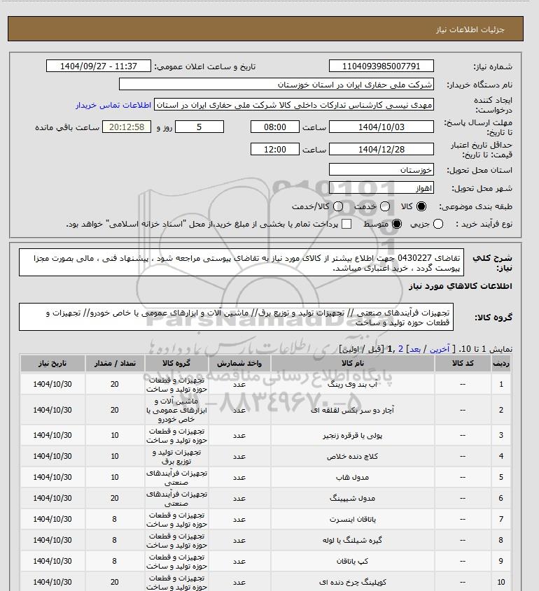 توضیحات خریدار:تقاضای 0430227 جهت اطلاع بیشتر از کالای مورد نیاز به تقاضای پیوستی مراجعه شود ، پیشنهاد فنی ، مالی بصورت مجزا پیوست گردد ، خرید اعتباری میباشد.