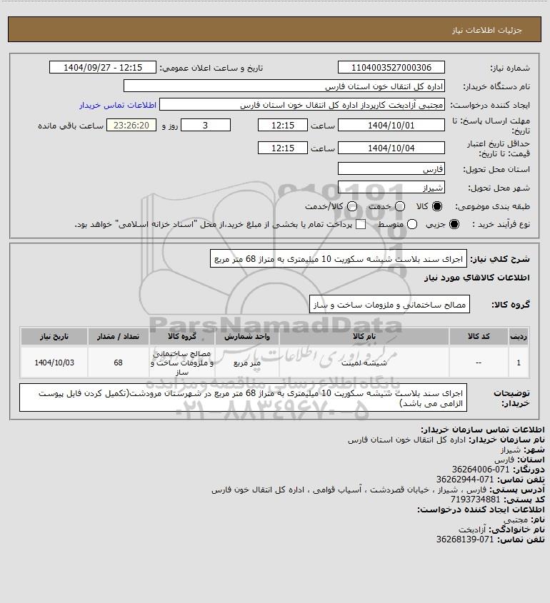 شرح کلی نیاز: اجرای سند بلاست شیشه سکوریت 10 میلیمتری به متراژ 68 متر مربع