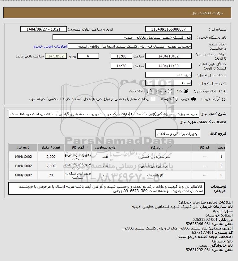 شرح کلی نیاز: خرید تجهیزات دندانپزشکی(ازایران کدمشابه)دارای بارکد دو بعدی وبرچسب شبنم و گواهی آیمدباشدپرداخت دوماهه است