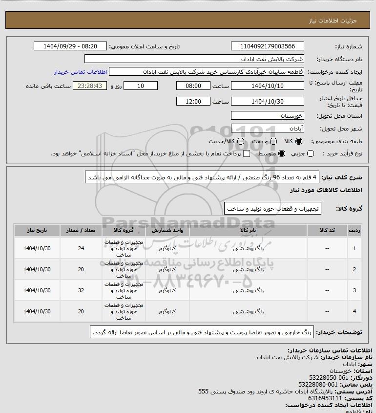 شرح کلی نیاز: 4 قلم به تعداد 96 رنگ صنعتی / ارائه پیشنهاد فنی و مالی به صورت جداگانه الزامی می باشد