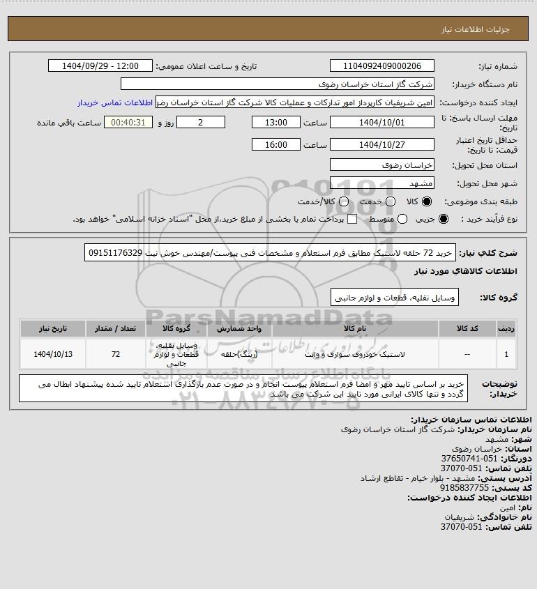 شرح کلی نیاز: خرید 72 حلقه لاستیک مطابق فرم استعلام و مشخصات فنی پیوست/مهندس خوش نیت 09151176329
