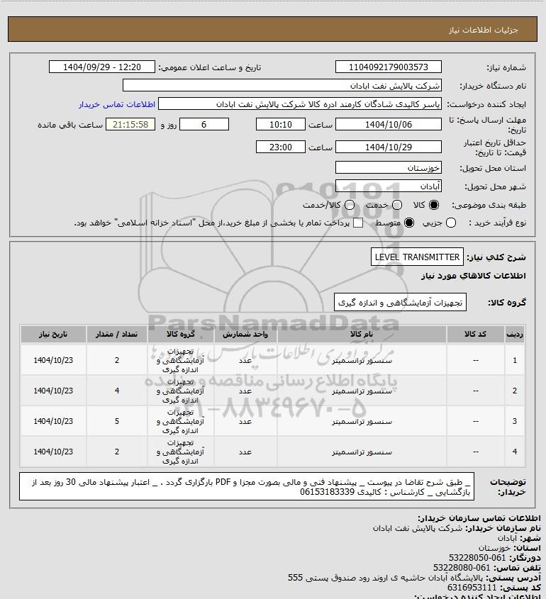 شرح کلی نیاز: LEVEL TRANSMITTER