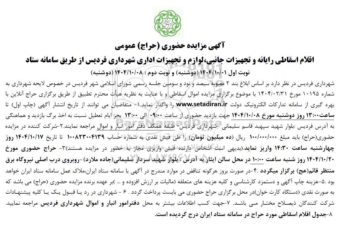 شهرداری فردیس در نظر دارد براساس ابلاغ بند 2 مصوبه سیصد و نود و سومین جلسه رسمی شورای اسلامی شهر فردیس در خصوص لایحه شهرداری به شماره 10195 مورخ 1404.02.31 با موضوع برگزاری مزایده اموال اسقاطی و با عنایت به نظریه هیأت محترم تطبیق از طریق برگزاری حراج آنلاین با بهره گیری از سامانه تدارکات الکترونیک دولت ستاد ایران را واگذار نماید. 1- متقاضیان می توانند از تاریخ انتشار آگهی (چاپ اول) تا ساعت 13:00 روز دوشنبه مورخ 1404.10.08 جهت بازدید حضوری از ساعت 09:00 الی 13:00 بجز ایام تعطیل نسبت به اخذ برگ بازدید و هماهنگی به آدرس فردیس: بلوار شهید سپهبد قاسم سلیمانی - شهرداری فردیس - طبقه همکف دفتر امور انبار و اموال مراجعه نمایند . 2 - شرکت کننده در مزایده حضوری (حراج) باید مبلغ 100.000.000 ریال (ده میلیون تومان) را طی فیش نقدی به شماره حساب 100823004139 تا تاریخ 1404.10.17 روز چهارشنبه ساعت 14:30 واریز نماید. (بدیهی است اشخاص دارنده فیش واریزی مجاز به حضور در مزایده هستند) 3- حراج حضوری مورخ 1404.10.20 روز شنبه ساعت 10:00 در محل سالن ایثار به آدرس : بلوار شهید سردار سلیمانی (جاده ملارد) - روبروی درب اصلی نیروگاه برق منتظر قائم (عج) برگزار می گردد 4- در صورت بروز هرگونه تناقض در موارد مندرج در آگهی با سامانه ستاد ایران ملاک عمل سامانه ستاد ایران خواهد بود 5- هزینه چاپ آگهی و دستمزد کارشناسی و کلیه هزینه های متعلقه (مالیات بر ارزش افزوده و ...) بر عهده برنده مزایده حضوری (حراج) می باشد که به صورت نقدی (دستگاه کارت خوان) در محل برگزاری حراج حضوری می بایست پرداخت گردد . 6 - شهرداری در رد یا قبول یک یا کلیه پیشنهادات شرکت کنندگان ذیصلاح مختار می باشد. 7- جهت کسب اطلاعات بیشتر به محل دفتر امور انبار و اموال شهرداری فردیس مراجعه نمایید. 8- جدول اقلام اسقاطی مورد حراج در سامانه ستاد ایران درج گردیده است.