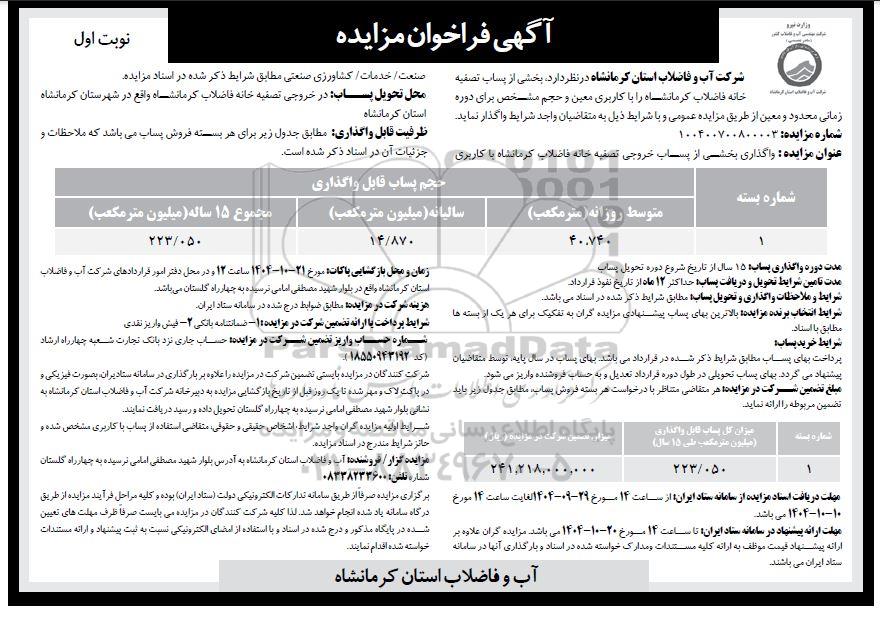 شرکت آب و فاضلاب استان کرمانشاه در نظر دارد بخشی از پساب تصفیه خانه فاضلاب کرمانشاه را با کاربری معین و حجم مشخص برای دوره زمانی محدود و معین از طریق مزایده عمومی و با شرایط ذیل به متقاضیان واجد شرایط واگذار نماید.
