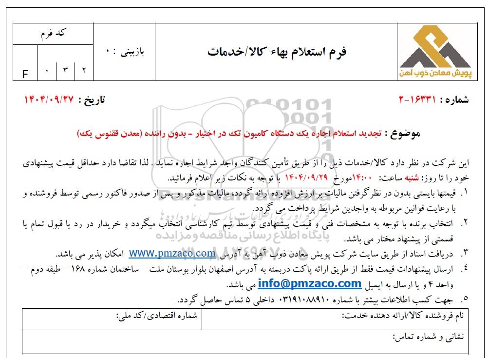 این شرکت در نظر دارد کالا / خدمات ذیل را از طریق تأمین کنندگان واجد شرایط اجاره نماید. لذا تقاضا دارد حداقل قیمت پیشنهادی خود را تا روز: شنبه ساعت: 14:00 مورخ: 1404.09.29 با توجه به نکات زیر اعلام فرمائید.