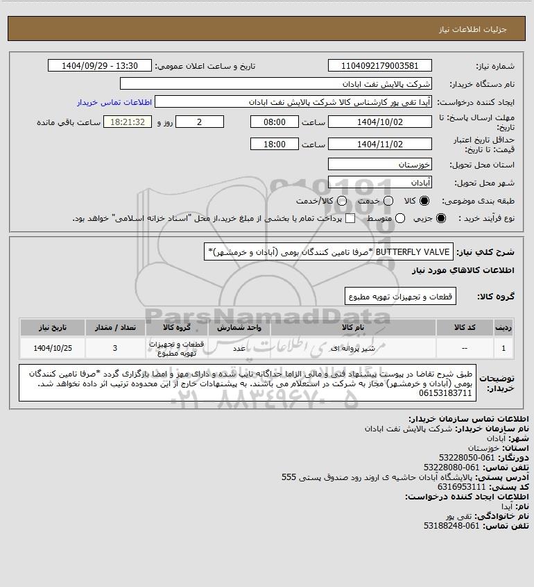 شرح کلی نیاز: BUTTERFLY VALVE *صرفا تامین کنندگان بومی (آبادان و خرمشهر)*