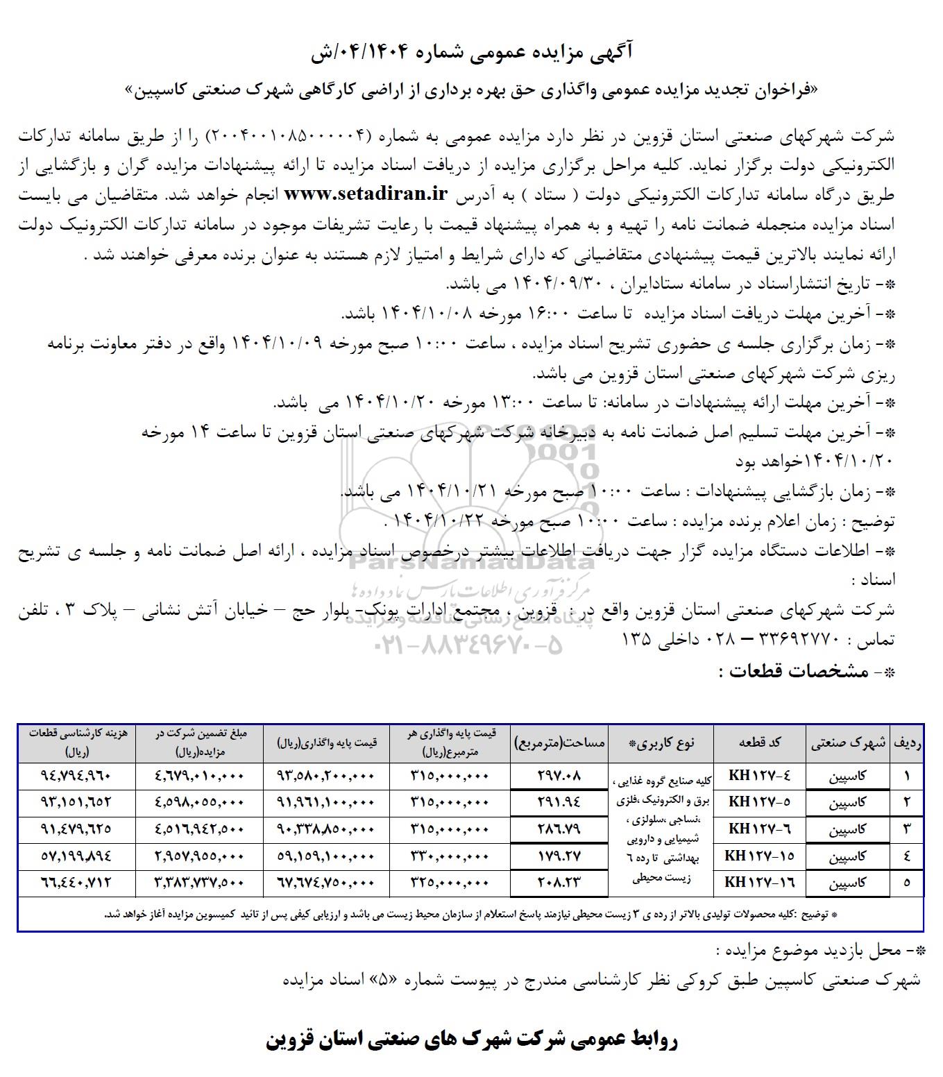 شرکت شهرکهای صنعتی استان قزوین در نظر دارد مزایده عمومی به شماره 2004001085000004 را از طریق سامانه تدارکات الکترونیکی دولت برگزار نماید کلیه مراحل برگزاری مزایده از دریافت اسناد مزایده تا ارائه پیشنهادات مزایده گران و بازگشایی از طریق درگاه سامانه تدارکات الکترونیکی دولت ( ستاد ) به آدرس سایت ستاد ایران انجام خواهد شد. متقاضیان می بایست اسناد مزایده منجمله ضمانت نامه را تهیه و به همراه پیشنهاد قیمت با رعایت تشریفات موجود در سامانه تدارکات الکترونیک دولت ارائه نمایند بالاترین قیمت پیشنهادی متقاضیانی که دارای شرایط و امتیاز لازم هستند به عنوان برنده معرفی خواهند شد .