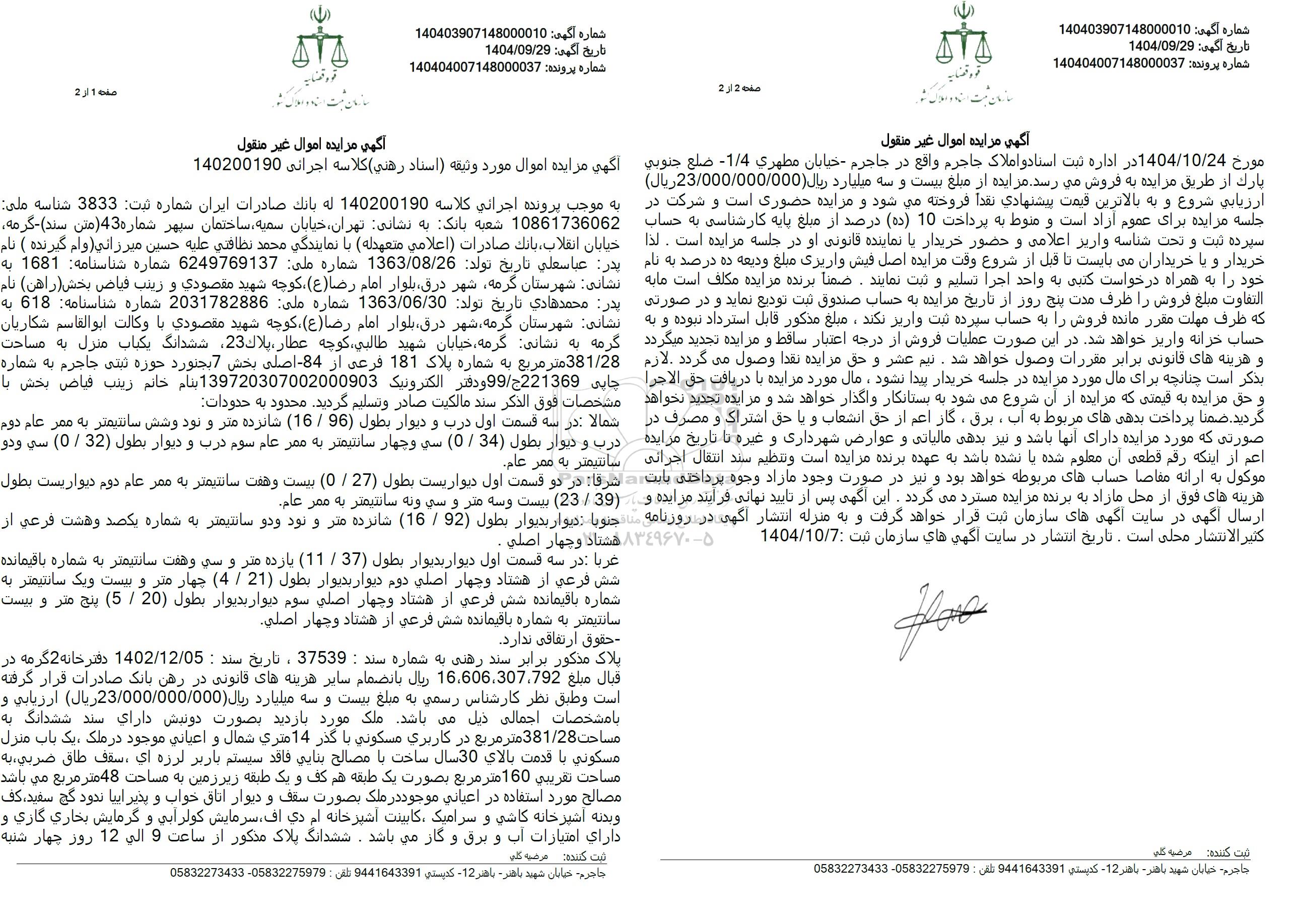 پلاک مذکور برابر سند رهنی به شماره سند : 37539، تاریخ سند : 1402.12.05 دفتر خانه 2 گرمه در قبال مبلغ 16,606,307,792 ریال بانضمام سایر هزینه های قانونی در رهن بانک صادرات قرار گرفته است و طبق نظر کارشناس رسمی به مبلغ بیست و سه میلیارد ریال (23.000.000.000 ریال) ارزیابی و با مشخصات اجمالی ذیل می باشد. ملک مورد بازدید بصورت دوستش دارای سند ششدانگ به مساحت 381.28 متر مربع در کاربری مسکونی با گذر 14 متری شمال و اعیانی موجود در ملک یک باب منزل مسکونی با قدمت بالای 30 سال ساخت با مصالح بنایی فاقد سیستم باربر لرزه ای ، سقف طاق ضربی به مساحت تقریبی 160 متر مربع بصورت یک طبقه هم کف و یک طبقه زیرزمین به مساحت 48 متر مربع می باشد. مصالح مورد استفاده در اعیانی موجود در ملک بصورت سقف و دیوار اتاق خواب و پذیراییا ندود گچ سفید کف وبدنه اشپزخانه کاشی و سرامیک کابینت اشپز خانه ام دی اف سرمایش کولرایی و گرمایش بخاری گازی و دارای امتیازات آب و برق و گاز میباشد . ششدانگ پلاک مذکور از ساعت 9 الی 12 روز چهار شنبه مورخ 1404.10.24 در اداره ثبت اسناد و املاک جاجرم واقع در جاجرم خیابان مطهری -1.4 ضلع جنوبی بارک از طریق مزایده به فروش می رسد. مزایده از مبلغ بیست و سه میلیارد ریال (23.000.000.000 ریال) ارزیابی شروع و به بالاترین قیمت پیشنهادی نقدا فروخته میشود و مزایده حضوری است و شرکت در جلسه مزایده برای عموم اراد است و منوط به پرداخت 10 (ده) درصد از مبلغ پایه کارشناسی به حساب سپرده ثبت و تحت شناسه واریز اعلامی و حضور خریدار با نماینده قانونی او در جلسه مزایده است . لذا خریدار و یا خریداران می بایست تا قبل از شروع وقت مزایده اصل فیش واریزی مبلغ ودیعه ده درصد به نام خود را به همراه درخواست کتبی به واحد اجرا تسلیم و ثبت نمایند. ضمنا برنده مزایده مکلف است مایه التفاوت مبلغ فروش را ظرف مدت پنج روز از تاریخ مزایده به حساب صندوق ثبت تودیع نماید و در صورتی که ظرف مهلت مقرر مانده فروش را به حساب سپرده ثبت واریز نکند، مبلغ مذکور قابل استرداد نبوده و به حساب خزانه واریز خواهد شد. در این صورت عملیات فروش از درجه اعتبار ساقط و مزایده تجدید میگردد و هزینه های قانونی برابر مقررات وصول خواهد شد . تیم عشر و حق مزایده نقدا وصول می گردد. لازم بذکر است چنانچه برای مال مورد مزایده در جلسه خریدار پیدا نشود، مال مورد مزایده با دریافت حق الاجرا و حق مزایده به قیمتی که مزایده از آن شروع میشود به بستانکار واگذار خواهد شد و مزایده تجدید نخواهد گردید. ضمنا پرداخت بدهی های مربوط به آب ، برق ، گار اعم از حق انشعاب و یا حق اشتراک و مصرف در صورتی که مورد مزایده دارای آنها باشد و نیز بدهی مالیاتی و عوارض شهرداری و غیره تا تاریخ مزایده اعم از اینکه رقم قطعی آن معلوم شده یا نشده باشد به عهده برنده مزایده است و تنظیم سند انتقال اجرائی موکول به ارائه مفاصا حسابهای مربوطه خواهد بود و نیز در صورت وجود مازاد وجوه پرداختی بابت هزینه های فوق از محل مازاد به برنده مزایده مسترد می گردد. این آگهی پس از تایید نهایی فرایند مزایده و ارسال آگهی در سایت آگهی های سازمان ثبت قرار خواهد گرفت و به منزله انتشار آگهی در روزنامه کثیر الانتشار محلی است. تاریخ انتشار در سایت آگهی های سازمان ثبت : 1404.10.7