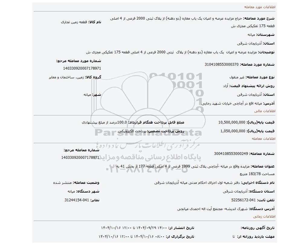 عنوان معامله: مزایده واقع در میانه -آچاچی پلاک ثبتی 1999 فرعی از 4 اصلی قطعه 177 از بخش 41 به مساحت 183/78 متربع