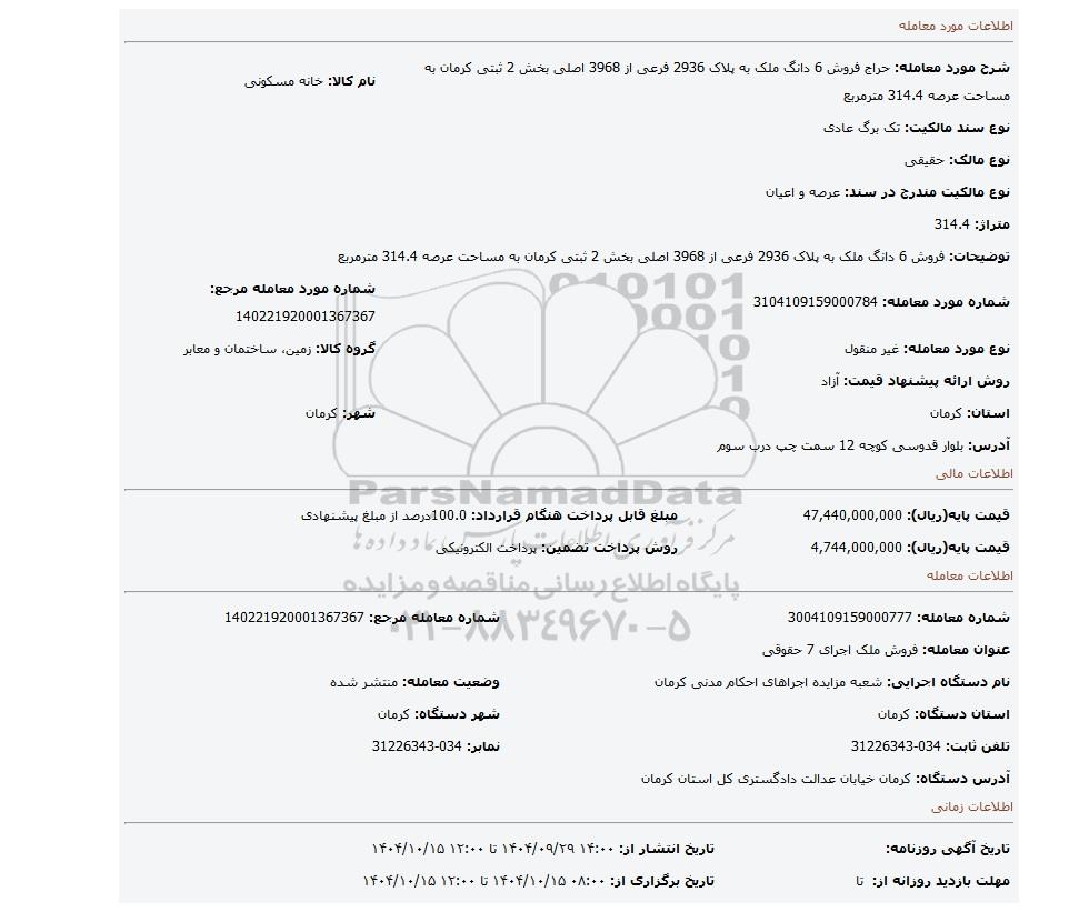 | شرح مورد معامله: حراج فروش 6 دانگ ملک به پلاک 2936 فرعی از 3968 اصلی بخش 2 ثبتی کرمان به مساحت عرصه 314.4 مترمربع | نام کالا: خانه مسکونی | |